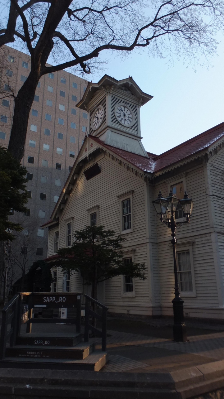 大通公園の近くのホテルに泊まったのですが、早朝に目が覚めてしまったので、思い切って散歩に出てみました。その時に札幌時計台にもちょっと寄ってみました。前日の昼間に見たときよりも落ち着いた感じに見えました。