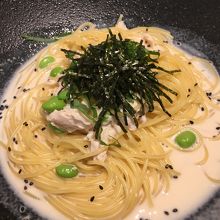 京都駅地下街にある和風パスタ店です。ランチタイムに寄りました。女性客が多いですが、男性二人で入っても、違和感は感じませんでした。お値段は普通、ただ味はさっぱりしていて、美味しく感じました。ポルタのレストランとしては、中の中のでしょうか。