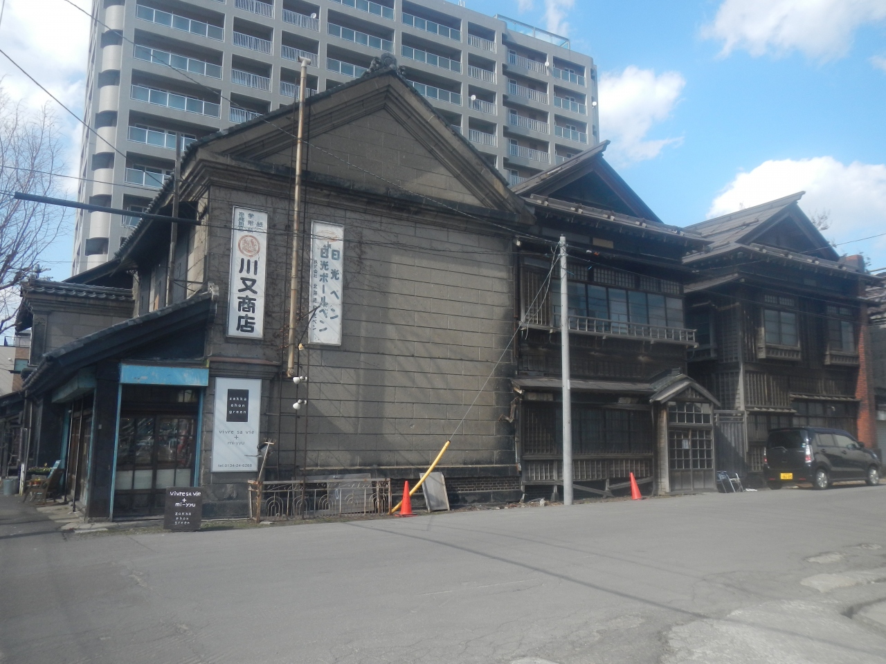 1905年に建てられたもの。現在は「vivre sa vie + mi-yyu」(ビブレ サ ヴィ プラス ミーユ)という、雑貨屋として使われている。当時の「川又商店」の看板が残っている。1904年に小樽で火災があり、その後で建てられたので防火用に「うだつ」がある建物になっている。(写真の左)