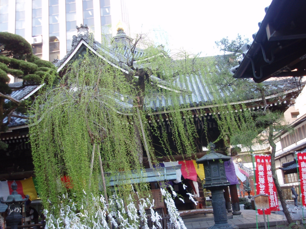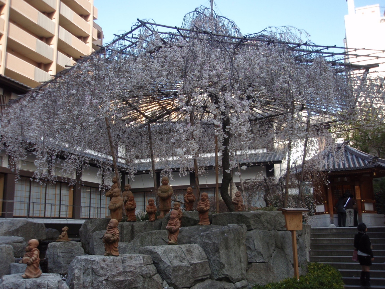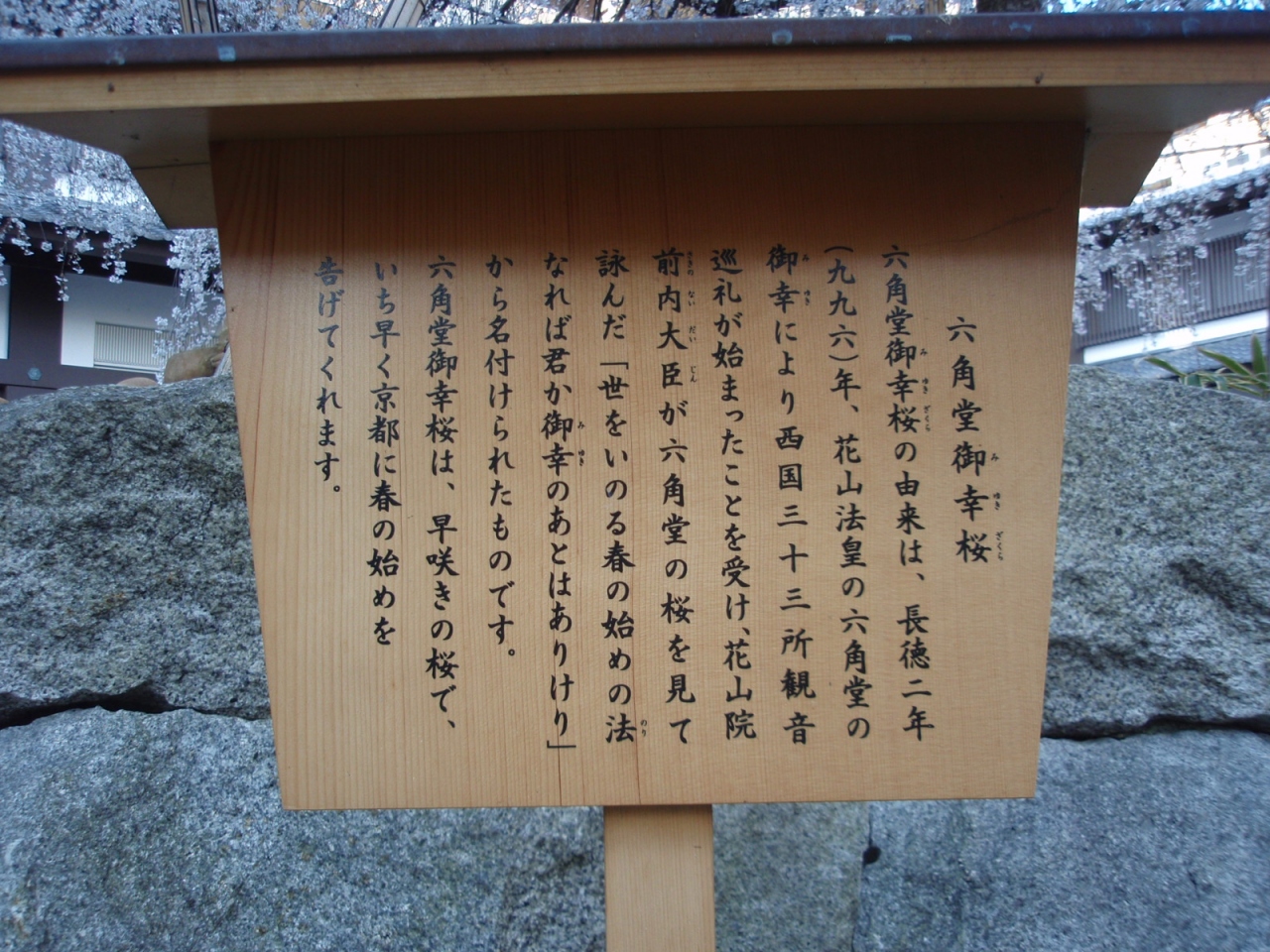 西国三十三ケ所霊場の御朱印を頂く目的で頂法寺に行ってきました。山門を入り正面に本堂、右に親鸞堂、奥に太子堂等が配置されている小さなお寺です。本堂の屋根が二重重ねの六角形造りになっているところから六角堂と呼ばれています。お寺にしては珍しい屋根です。写真は上手く撮影できませんでしたので、興味のある方は足を運んでみてください。寺の中央部、合掌地蔵がある所に早咲きの御幸桜が1本満開で、きれいでした。