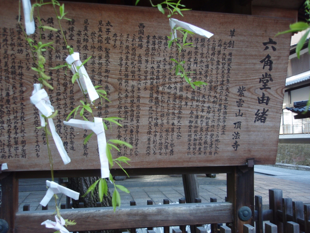 「概要」西国33ケ所霊場第十八番札所。天台宗の一寺。山号は紫雲山。 通称”六角堂”。創建は伝587年、開基は聖徳太子といわれ、本尊は聖徳太子の持仏といわれる如意輪観世音菩薩(秘仏)でる。