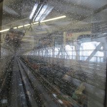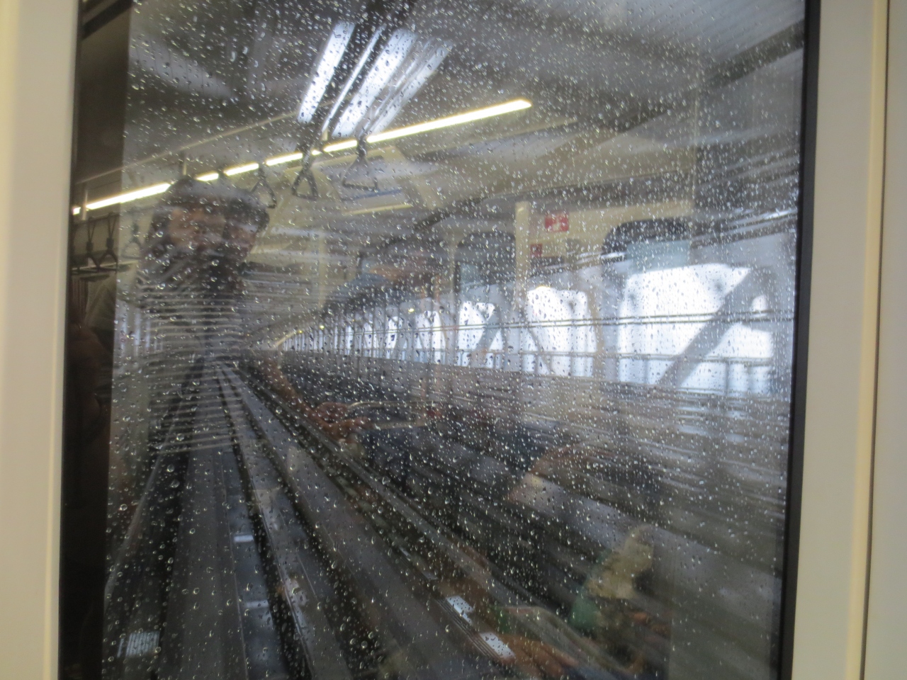 新橋からゆりかもめに乗車。運よく一番前に座れたので、乗車時からレインボーブリッジを通るのを楽しみにしてました。そしてぐるっとループを描くように進んでいくと、いよいよレインボーブリッジです。ちなみに構造は両側が車の道路になっていて、真ん中をこのゆりかもめが走るようになっています。なので残念ながら海沿いとはいきません。また上を首都高速が走っているので、前方を見るとちょっとしたトンネル状態。でもこれがなかなか面白かったです。