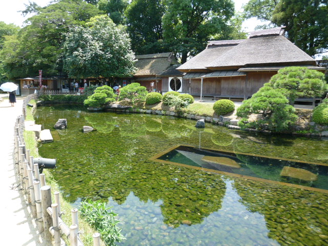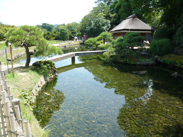今日は日本三名園のひとつである岡山後楽園を散策しています。岡山城から月見橋を渡って南口から後楽園に入りましたが、入口付近はちょっと高くなっていて、ここから見る後楽園の絶景には驚きです。そしてその右側に「廉池軒」はあります。あぁー藁ぶき屋根ですね素晴らしいです。戦災をまぬがれた建物とは聞いていましたが今も風情ある姿を残しています。また池に架かる橋も良いですね、石橋です。渡ることはできませんが、これもあまり観れるものではありません。横には休憩所らしき場所があります。素晴らしい後楽園です。
