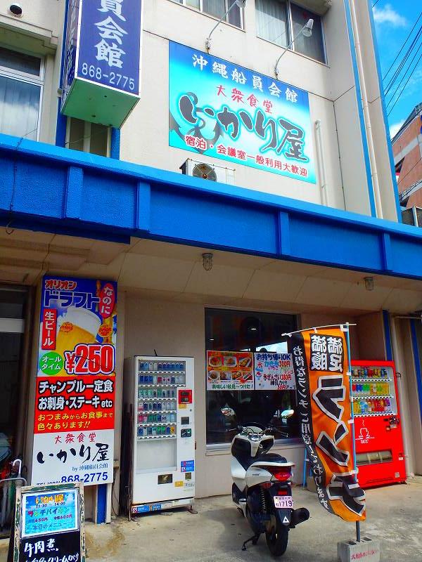 離島航路のターミナル、とまりん港の一角にある。宿泊施設船員会館が運営し、その一階にあるのがこの「いかり屋」だ。宿泊客が朝食を食べる場所であるが、ランチタイムになると、650円(女性は600円)のバイキング食堂になる。この日は、白身魚のクリームかけ、牛肉煮、きのこパスタがおかずで、あとは白いごはん、卵スープ、刻みキャベツ、コーヒー、ジュースなど飲み物、缶詰ミカンのデザートだった。牛肉煮は脂身の多い肉だったが、値段と量からすれば、こんなものかな。近隣で働いている人、近所のおばちゃん仲間といったローカル色豊かな客でにぎわっていた。