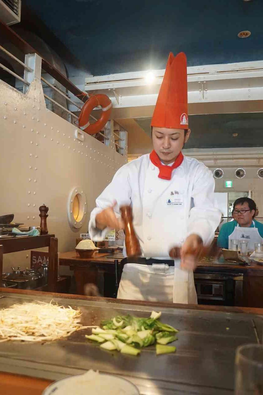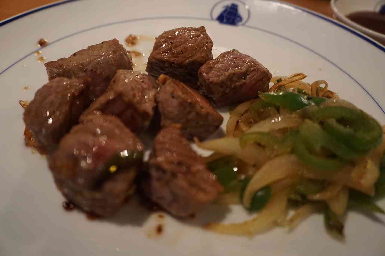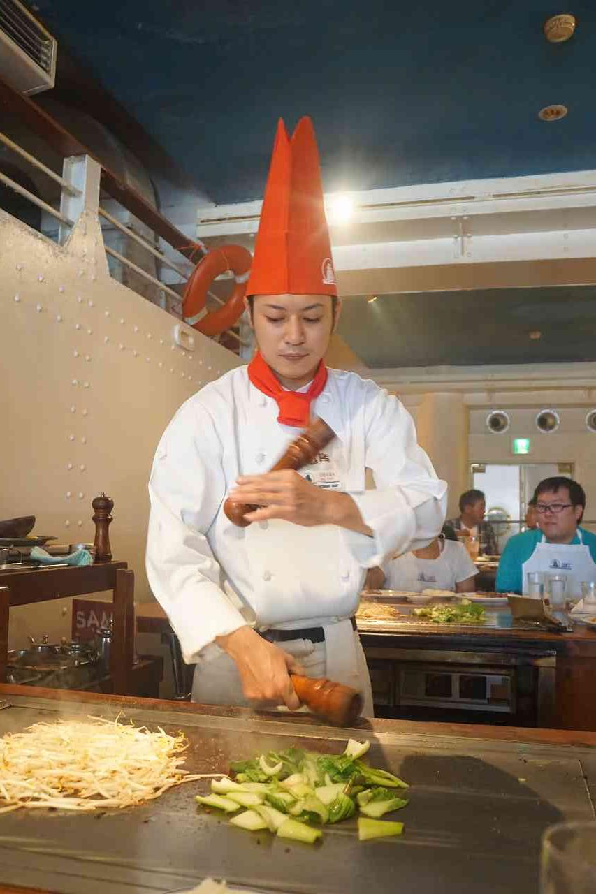 ツアーのオプションのランチで利用しました。基本的に5人くらいに対し一つの鉄板があり、シェフが実演しながら料理を作ってくれます。野菜を切ったり肉を切ったり見ていて飽きることはありません。6人くらいのシェフが同時に調理していますが、上手い下手はあるようです。我々のテーブルのシェフはイケメンの上に技術も確かで失敗しませんでした。礼儀正しい方で気持ち良く食事できました。お手頃価格でステーキを楽しむにはお薦めのお店です。