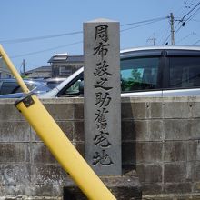 周布政之助旧宅地は、青空駐車場を囲むブロック塀の前。おまけに電柱の支えに少しかかるようなところに、それを示す石柱がありました。