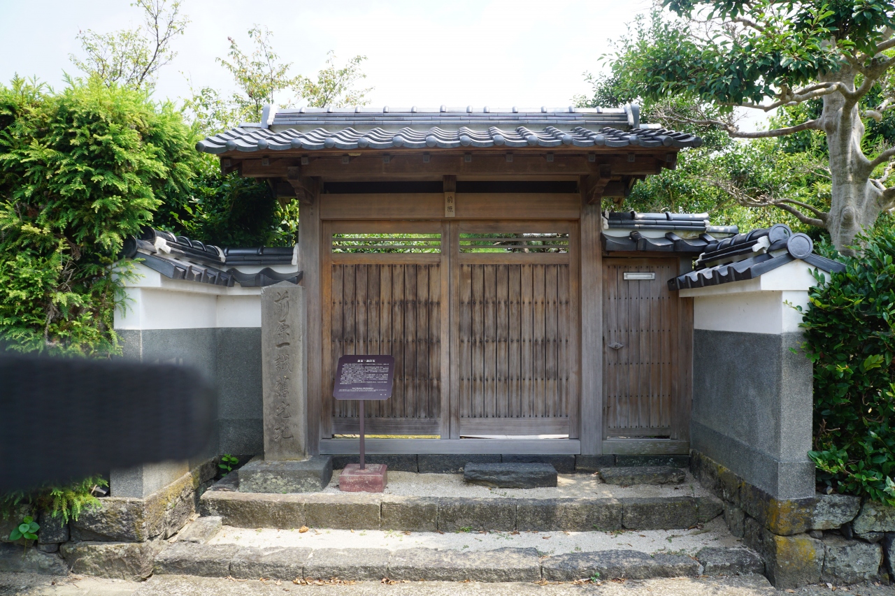 前原一誠旧宅は、住宅地の中なんですが奥まった場所なので、少し分かりにくいかもしれません。例によって、石柱と説明板がありますが、邸宅の門は涼しげな雰囲気です。