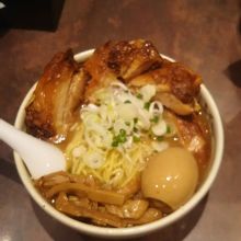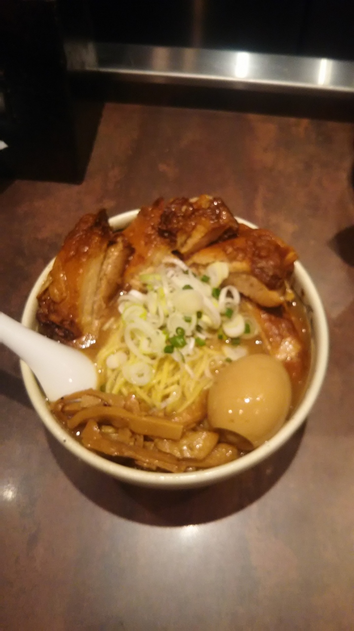 渋谷のハチ公口から徒歩3分、道玄坂にある武蔵の系列店。つけ麺がメインのようでしたが、気分的にラーメン、特製肉増し大盛りで。スープは武蔵系列の甘めの味付けで、麺とよく絡み、さらにデカ盛のチャーシューブロックが迫力。ただ、全部食べきるには自分の年齢を考えるべきでした。