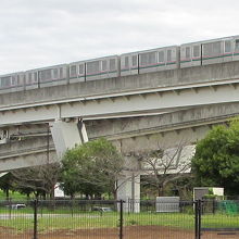 舎人ライナーには13の駅があります。そのうちの一つ・舎人公園駅近くには、地下に車両基地があります。基地を見ることはできませんが、舎人公園内にある連絡橋の上からは基地に向かう電車の姿を身近に見ることができます。連絡橋は珍しい景色が見える場所です。