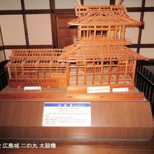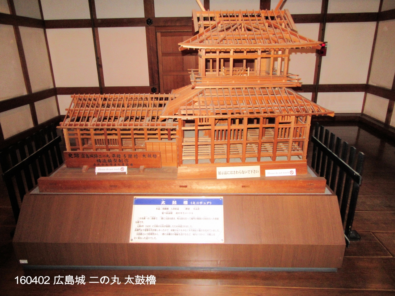 広島城の時計台として太鼓をたたいて時をしらせていたそうです。中は自由に見学ができ、見学者がたたける様に太鼓が置いてありますので、当時の役人の気分で叩いてみるのも良いともいます。本来は櫓の2階に太鼓が置かれていたそうですが、叩けるようにと1階に置いてあるそうです。中には、櫓の骨組みの模型もあり、参考になります。
