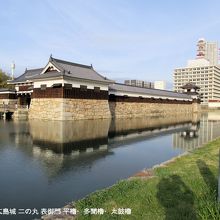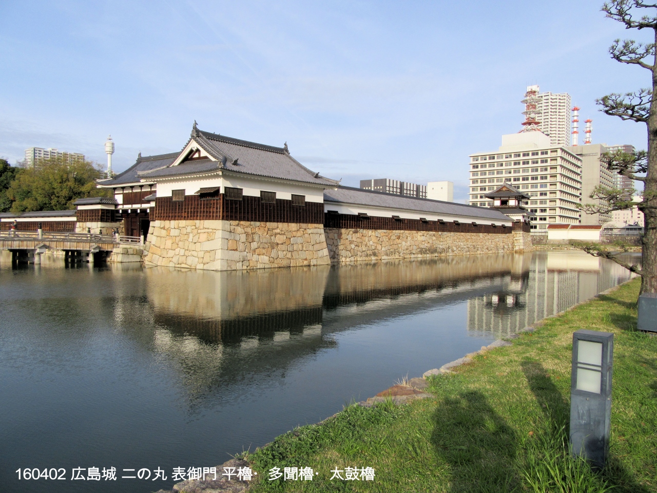 広島城の二の丸表御門に続く、入母屋造りの一重隅櫓です。内部は自由に見学することができ、中に入ると畳を敷いた座敷があり、柱と畳の風景が江戸時代の雰囲気を醸し出してくれています。窓枠越しに見える内堀も、なかなか風情があって良いです。