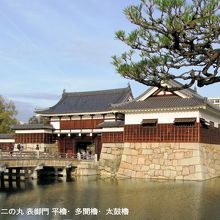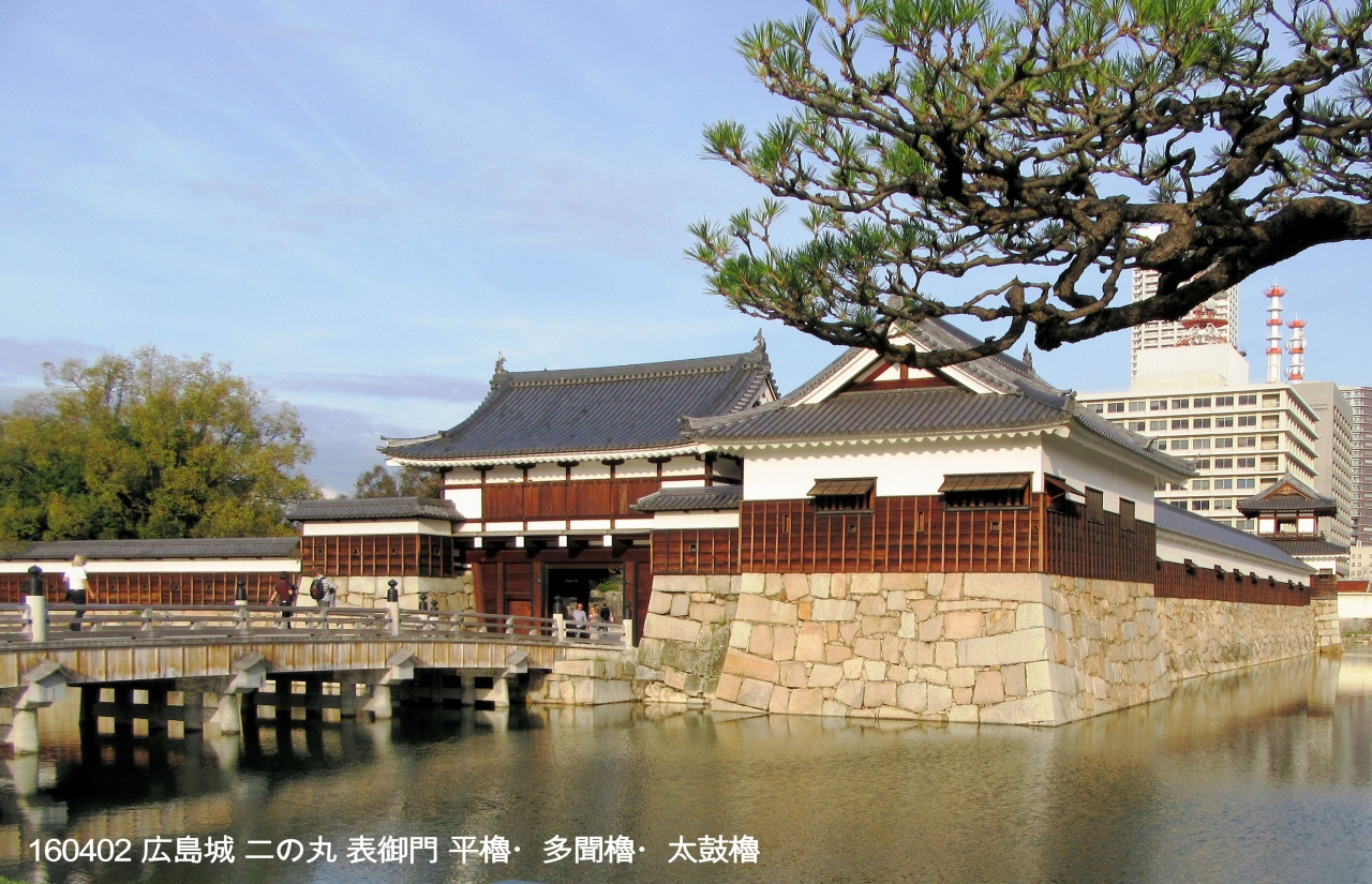 内堀をまたぎ、二の丸表御門にかかっている橋で、現在ではここが広島城の入口になります。橋を渡る前に少し後ろに戻って、橋を渡ったところにある表御門、その横に続く平櫓と御門橋を一枚の写真に収めると、肉眼で見る以上に絵になる風景だと思います。