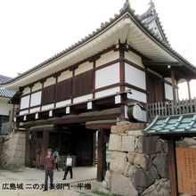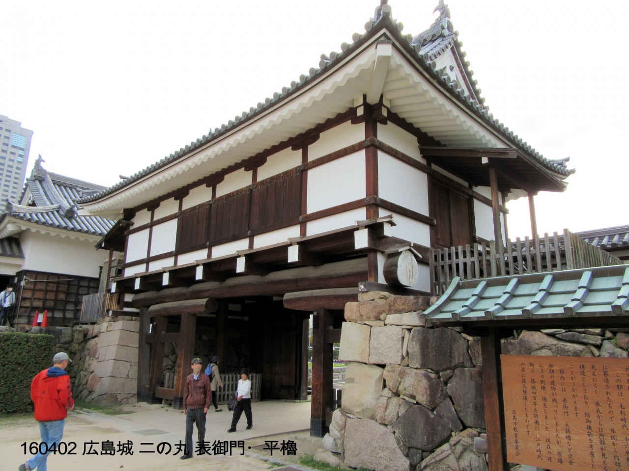 広島城二の丸入口にある表御門は、原爆で焼失してしまった門の礎石の上に、築城400年を記念して昔通りの工法で江戸時代の姿に復元された入母屋造の門です。毛利輝元、福島正則もかつてはこの門を出入りしていたのかと思うと、感慨もひとしおです。