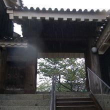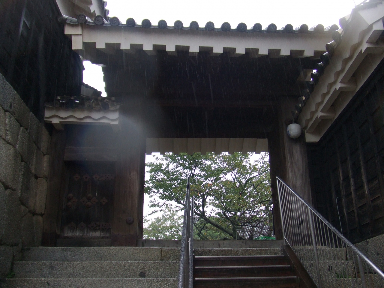 二ノ門は、脇戸付薬医門、本瓦葺。西端は脇戸柱を三ノ門南櫓に託して鏡柱との間に脇戸を設け、東端は鏡柱に二ノ門東塀が接続している。一ノ門~三ノ門をくぐって、あと少しで入城。ひどい雨でしたが期待が高まってきます。