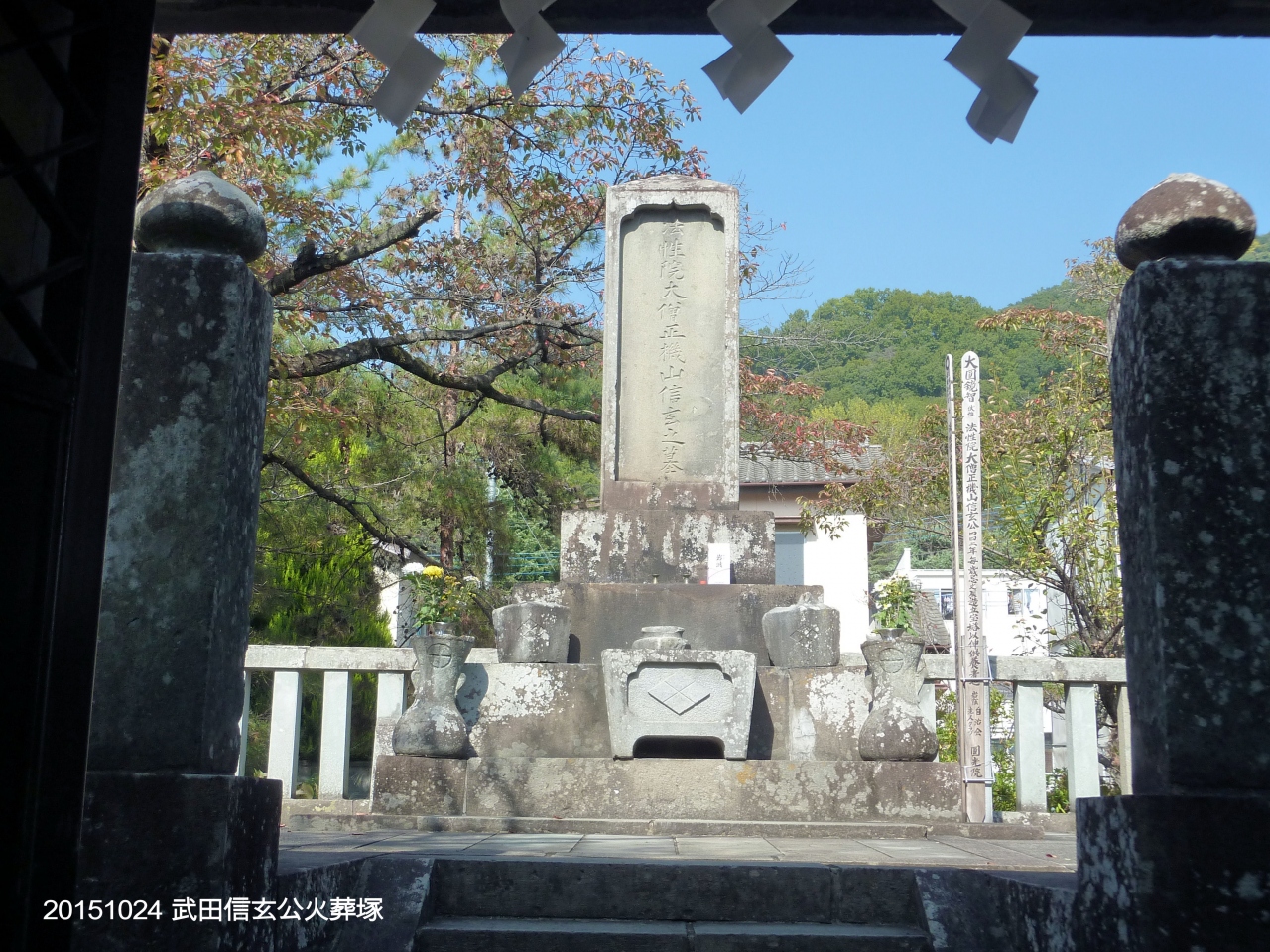 躑躅ケ崎館から甲府駅に向かって左手、少し入ったところに武田信玄のお墓があります。信玄の没後三年目に勝頼によって荼毘に附された後、江戸時代中期に甲府代官によって発掘され、信玄の石棺が発見されたことから墓所として整備されたとのことです。躑躅ケ崎館から歩いていくには少し距離がありますので、ピクニック気分でのんびり歩くか、自転車で巡ることをお勧めします。