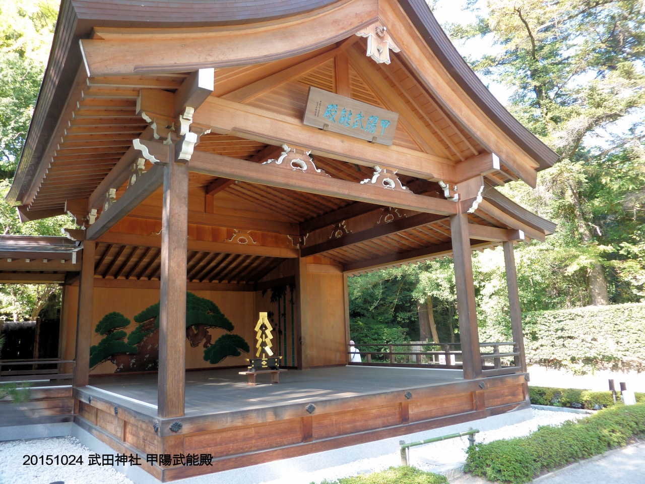 武田神社の本殿左手にある能舞台で、最近になって建てられた新しいものです。能、神楽などが実際に行われるそうで、雰囲気のある場所です。他にもアコースティックライブなども行われるそうで、現代社会との融合に取り組む姿勢が感じられました。