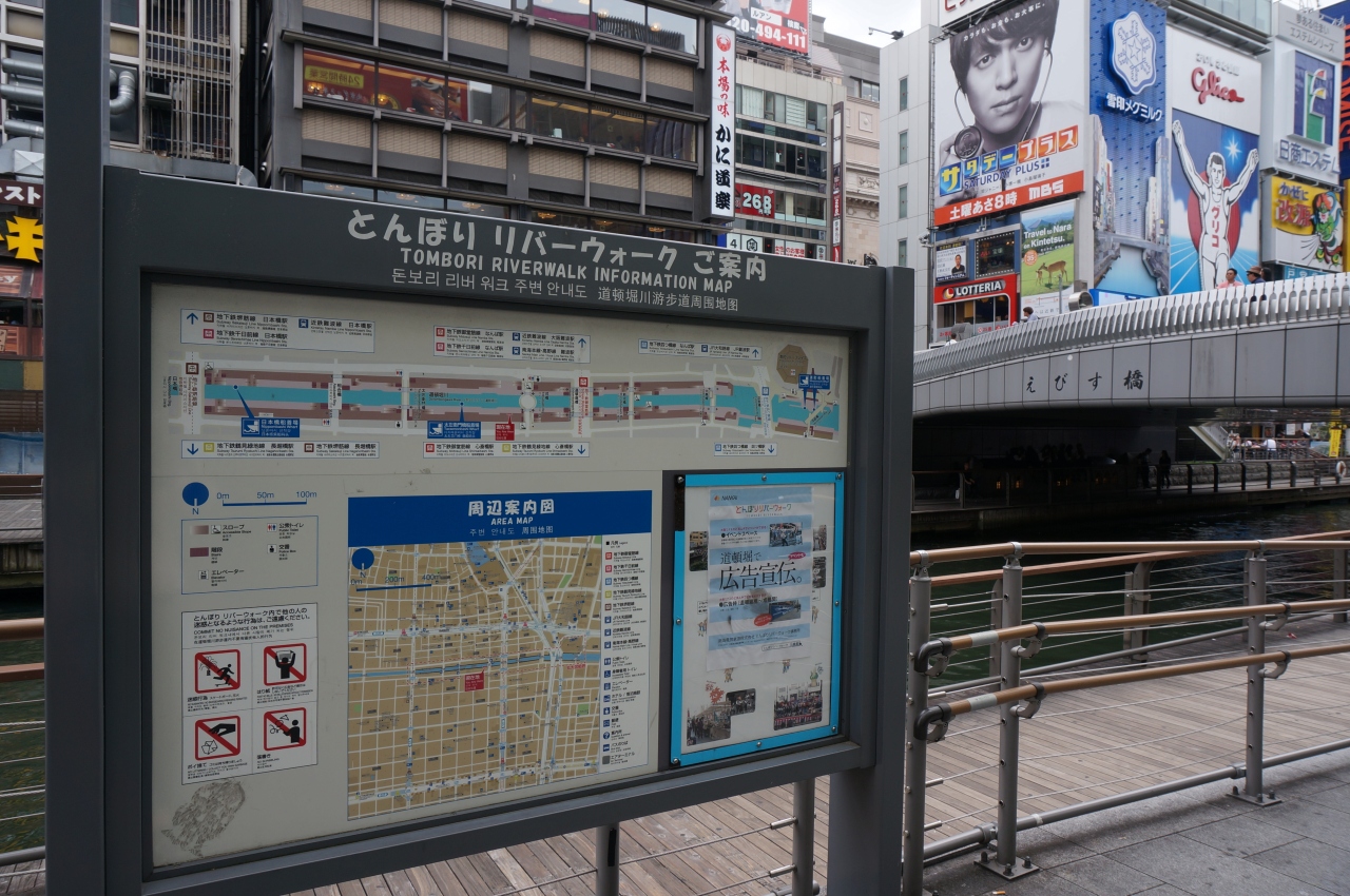 道頓堀川沿いに作られたウッドデッキっぽい通りです。ただ、周囲ががやがやした感じなのでおしゃれという雰囲気ではなかったです。この道の途中、ドンキホーテ前からは道頓堀川を一周してくるミニクルーズが出航していました。