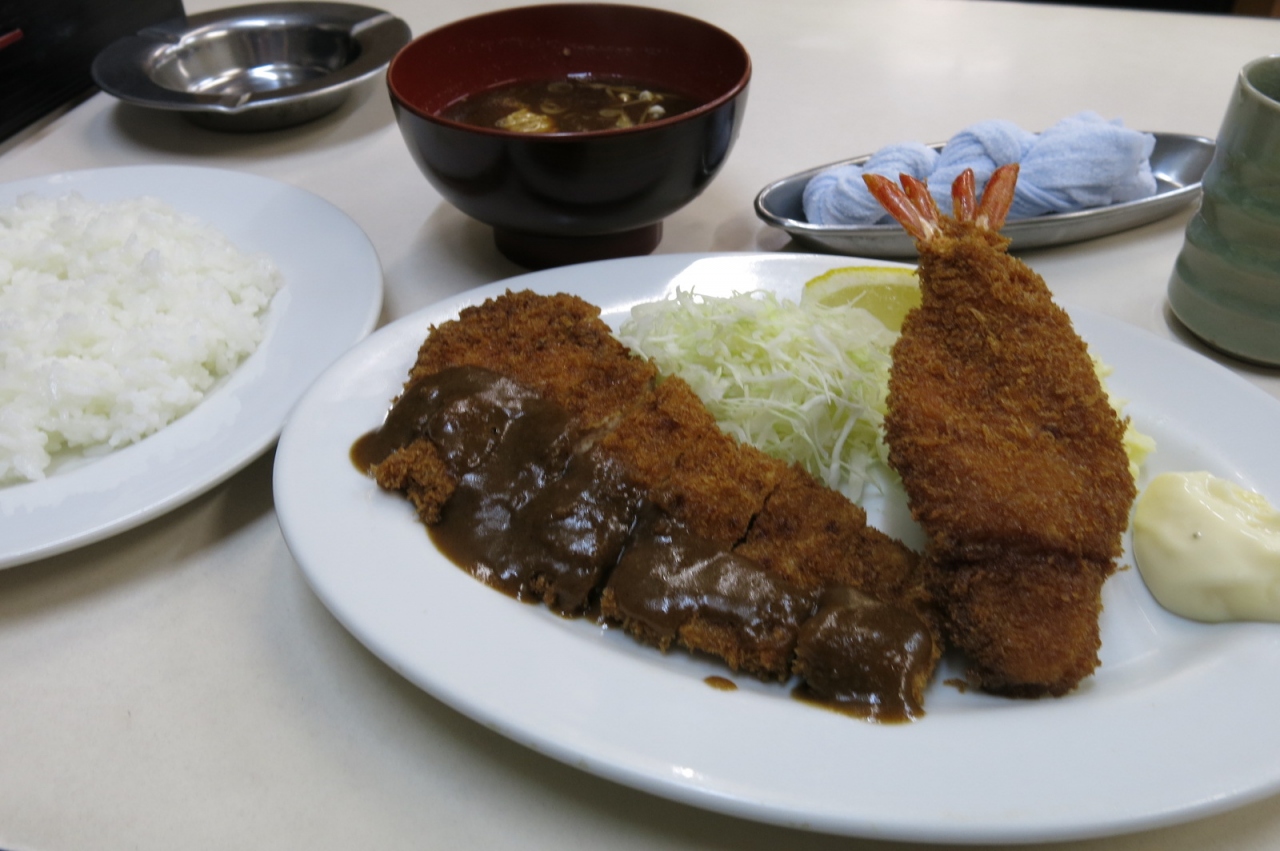昔ながらの洋食屋さんって感じで、昭和レトロを感じる円頓寺商店街に溶け込んでいました。基本は揚げ物中心ですね。”本日のランチ”(750円)を注文。海老フライ・とんかつ・赤だし・ライスのセット。海老フライは身を開いて揚げてありました。2種盛り(好きな揚げ物を2種類チョイス”っているメニューもありましたよ。