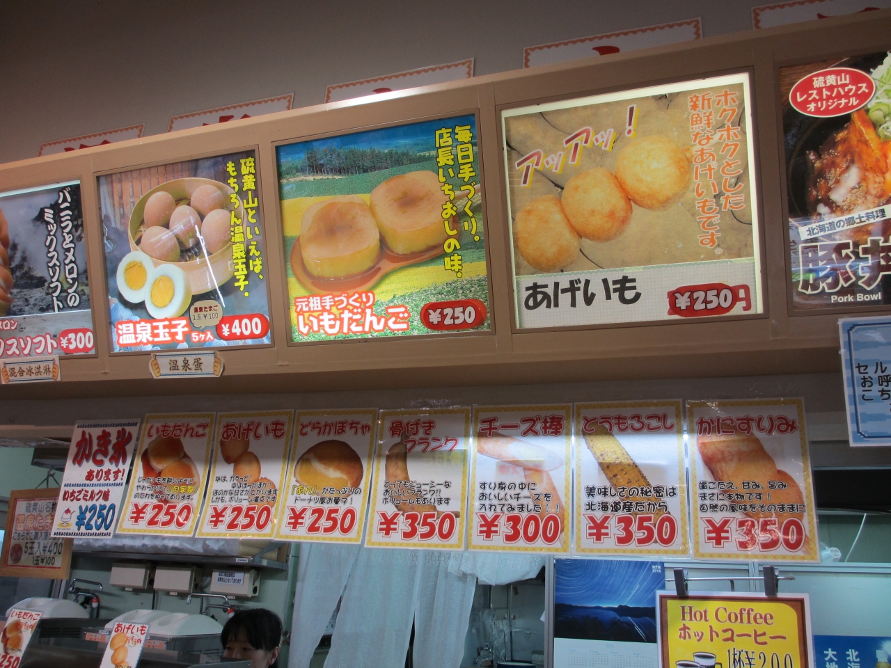 勢いよく蒸気が出ている硫黄山の駐車場にあります。北海道定番の各種土産物が売っているコーナーと硫黄山を眺める休憩所と軽食イートインコーナーが入っている建物です。名物温泉卵、ラーメン、いももち、ソフトクリームなどをイートインコーナーで売っています。訪れたのが夕方閉店前だったためか休憩所にはのぼり旗などが置いてあり休める状態ではなかったです。イートインのテーブル席には座って飲み物を飲んでいる客がいました。