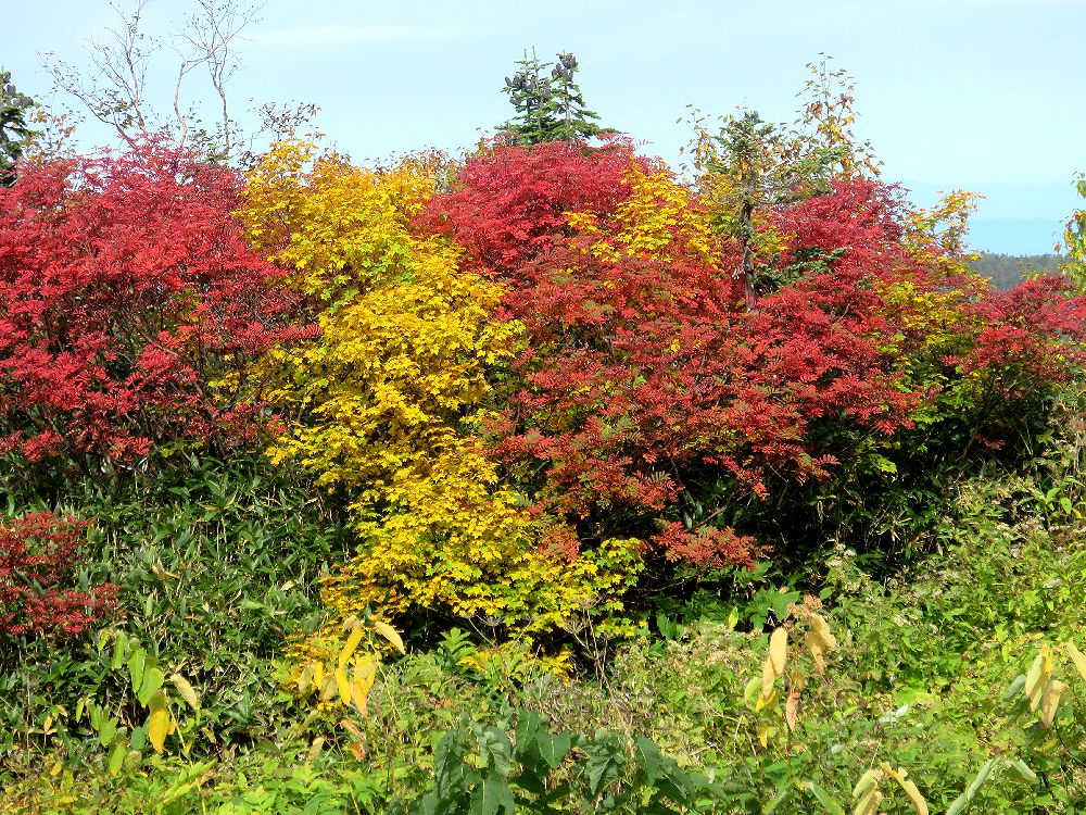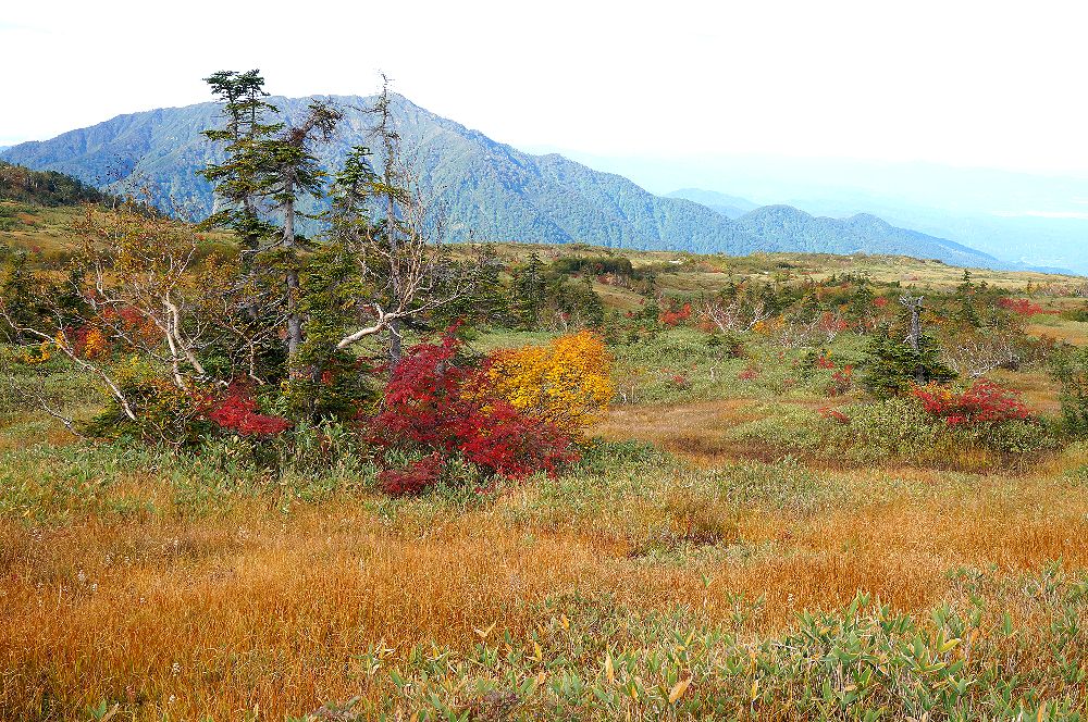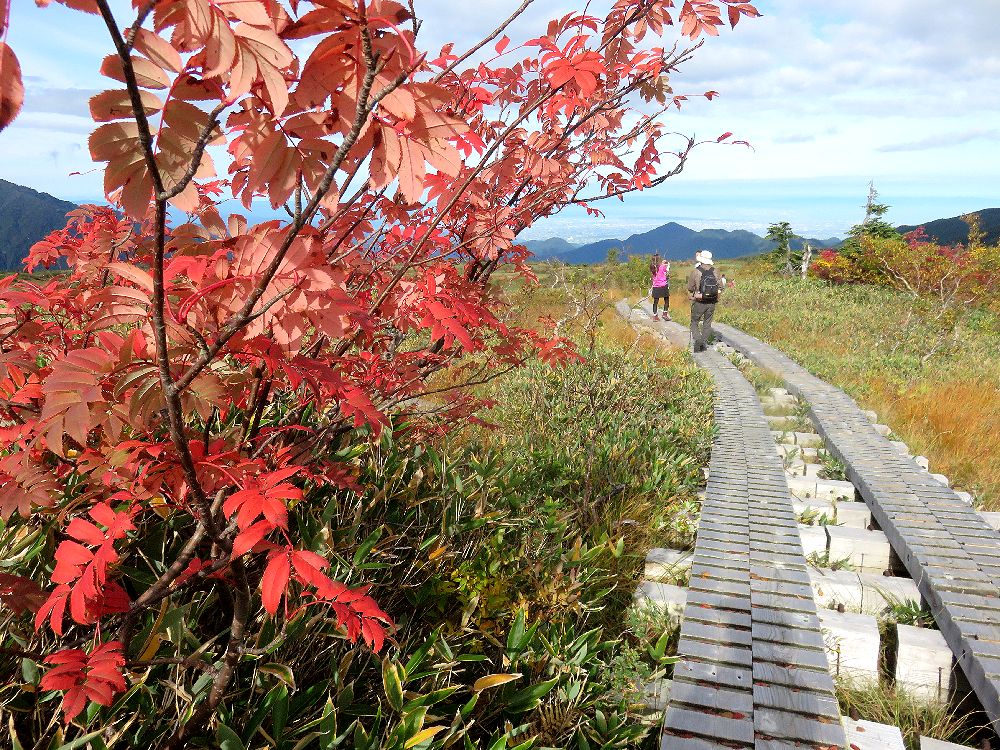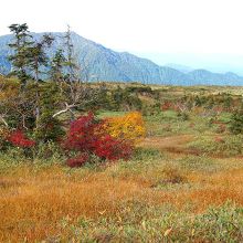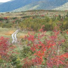 富山県側の立山黒部アルペンルートの美女平から天狗平までの間にある広大な湿原。私達は立山町から室堂まで往復したときに、行きは通過し、帰りは途中下車して短いコースを散策しました。紅葉の時期はアルペンルートの中でも早く、9月の20日ごろから草紅葉が紅葉し始め、私達が訪れた9月の末にはナナカマドなどの木々が紅葉のピークをむかえて、きれいでした。木道も整備され、ほぼ平坦で40分の短い周遊コースや1時間20分の長いコースも用意されています。弥陀ヶ原ホテルの裏から反時計回りに歩きましたが、最後が急な上りになっているので、足に自信がない人には時計回りに歩くことをお勧めします。