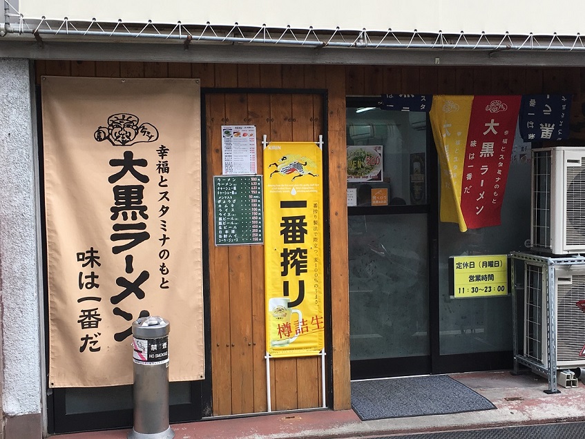 今日は京都東福寺駅前通りにある大黒ラーメンに来ています。大黒ラーメンと言えば桃山にもありますが、のれんもどんぶりも同じデザインです。店の造りや広さも同じ程度で昼過ぎに行きましたが行列はないものの相席です。普通のラーメンをいただきましたが桃山と同じとんこつ味で美味しいですねぇー、料金も同じ500円で桃山と同じく100円の割引券があり共通で使用できます。ラッキーでした。今から紅葉の時期、東福寺訪問の時は立ち寄ってくださいね。