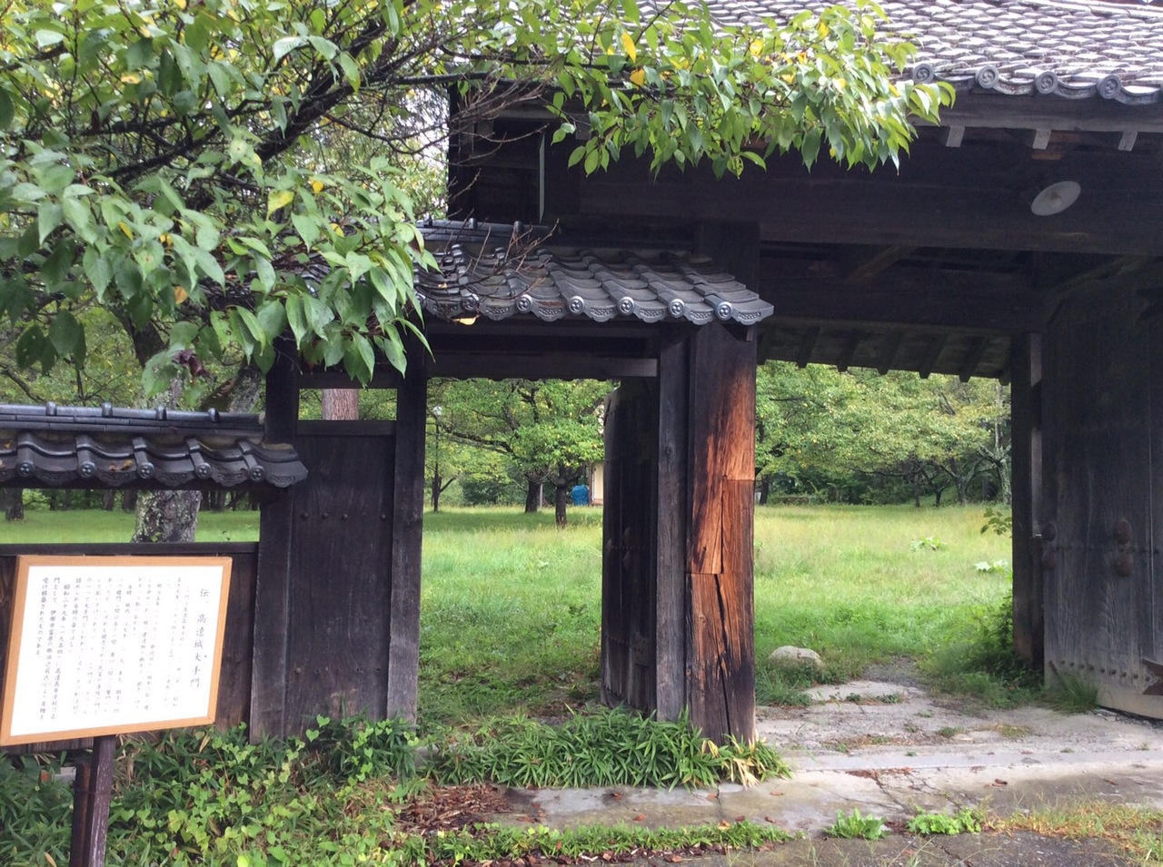 下から上がるとカーブになったあたりに石垣が見えました。廃城後に改築がされ、昔の姿とは異なとのこと。歴史を感じされる門ですが少し老朽化が目立ったような印象です。門の横には説明文があり門の中は芝生になっていてイヌの散歩をしている人がいました。大きな駐車場の前なので高遠城址公園に行く途中に寄りました。
