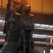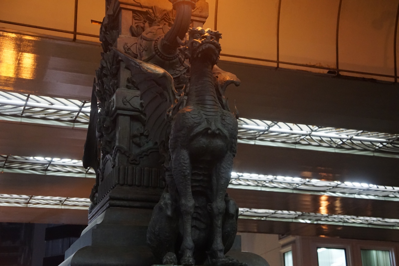 日本橋のちょうど中ほどの欄干の上に建つ麒麟像は、お座りの恰好をしています。顔は龍の顔と同じなんですが、その引き締まった体つきがトカゲみたいでちょっとリアルですね。ただ、上を高速道路が走っていて窮屈そう。早く何とかしてあげたいものです。