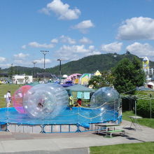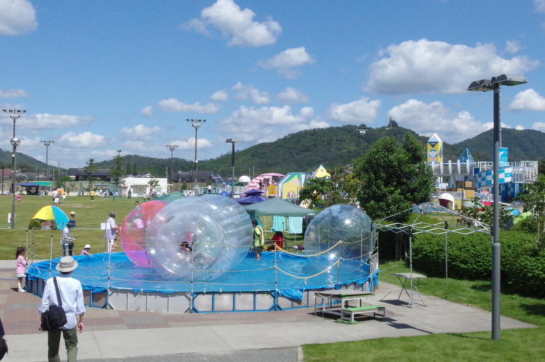 広島市から足を伸ばす人が多い人気の公園です。たくさんの遊具があるのですが、それらが回廊みたいな通路でつながっていて、子どもにはとてもワクワクさせる構造です。が一方、遊具の外で見守る親にとっては、あれうちの子今どこ行った?さっきまであそこに、となりやすい、見通しが悪い面もありけっこうハラハラします。有料ですが、ウォーターボールもやっています。駐車場は広いのですが、早い時間からいっぱいになります。