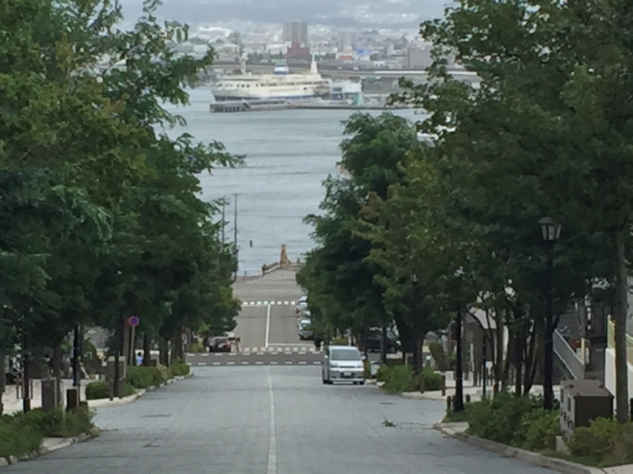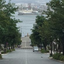 倉庫街から歩いていきました。海に向かって真っすぐの美しい道。正面に、記念館として港に係留展示されている青函連絡船・摩周丸を望めます。