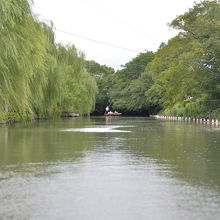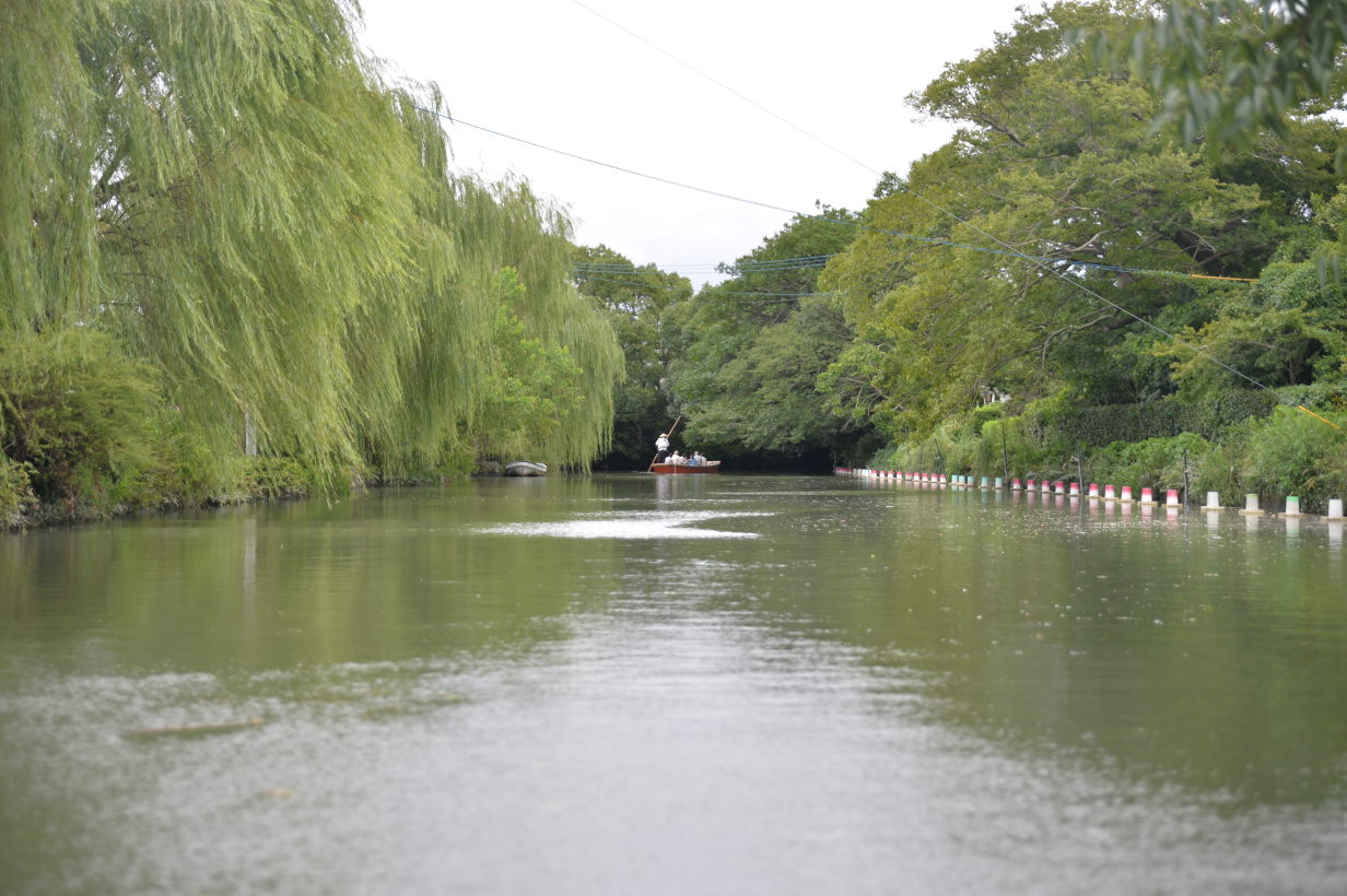 川下りの舟が堀の角を曲がったところに、葉が川面のほうにせりだしている大きな柳の木が見えるポイントがありますが、その景色が本当に美しくて、心が和みました。テレビのロケなどでもよく使われるそうです。一方で台風で倒れている柳もありました。