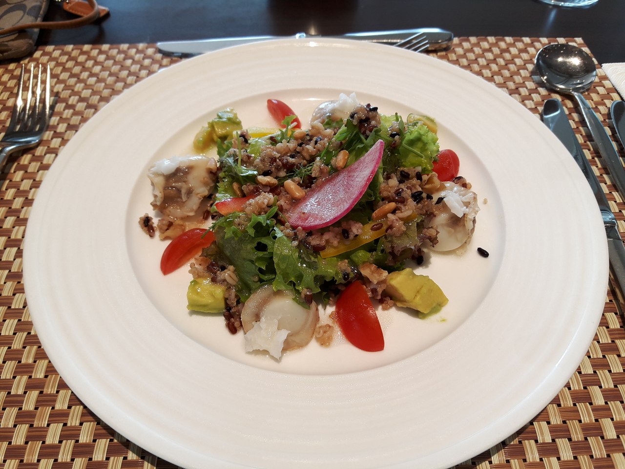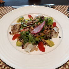 五階から海を見渡せるレストラン。季節のオーブコースは、4品にコーヒーまでついて1000カロリーちょっと。ハーブティーかフレーバーティーにもできます。秋のメニューはアボカド、キヌアホタテのサラダ、イベリコ豚ステーキとボリュームがあるのに、低カロリーで嬉しい。
