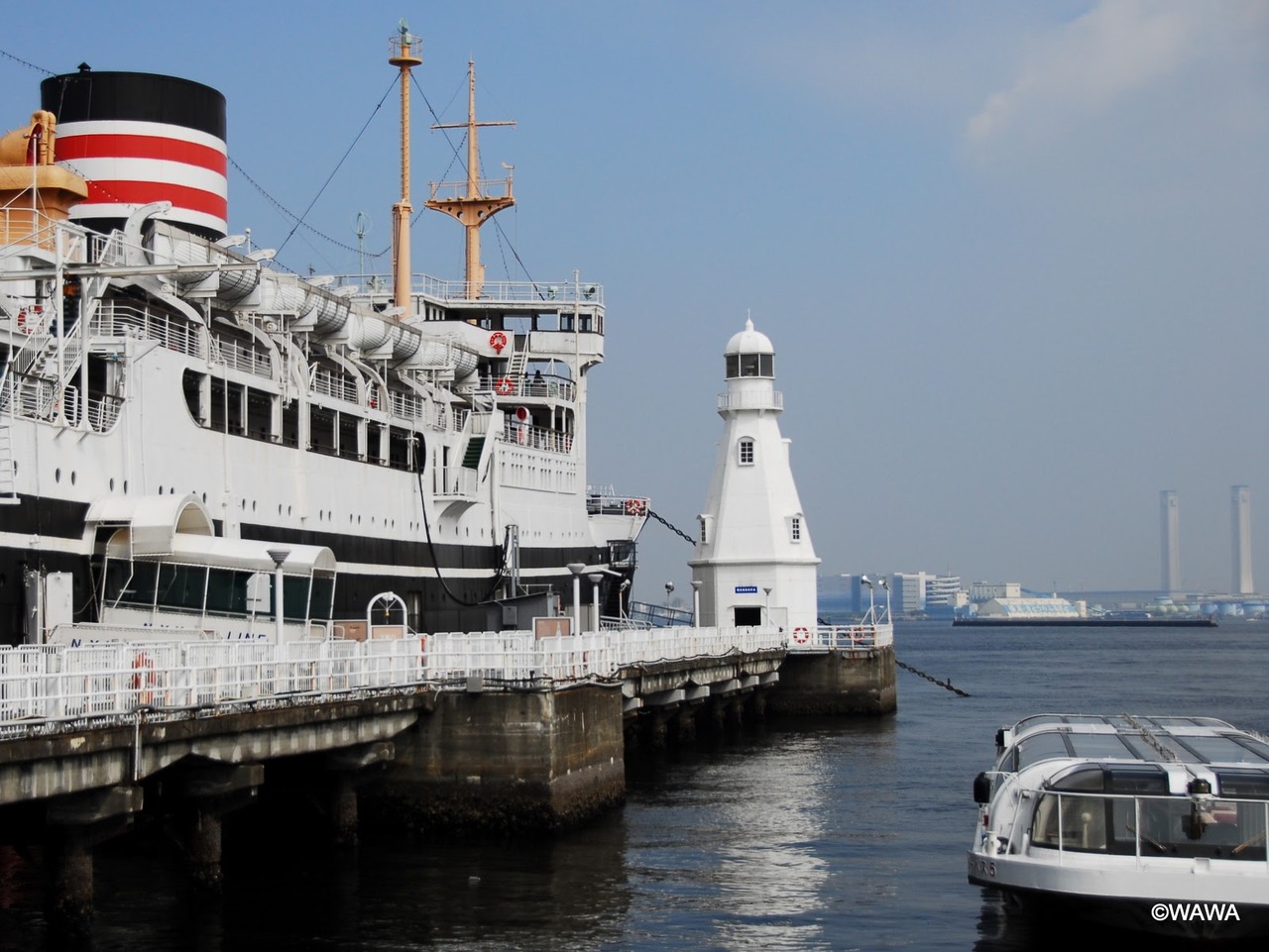 氷川丸の桟橋に移設されている昔の横浜港白灯台も氷川丸の現役時代とマッチしたデザインです。北からのアプローチだと氷川丸に隠れて見えないので、お見逃しなく。