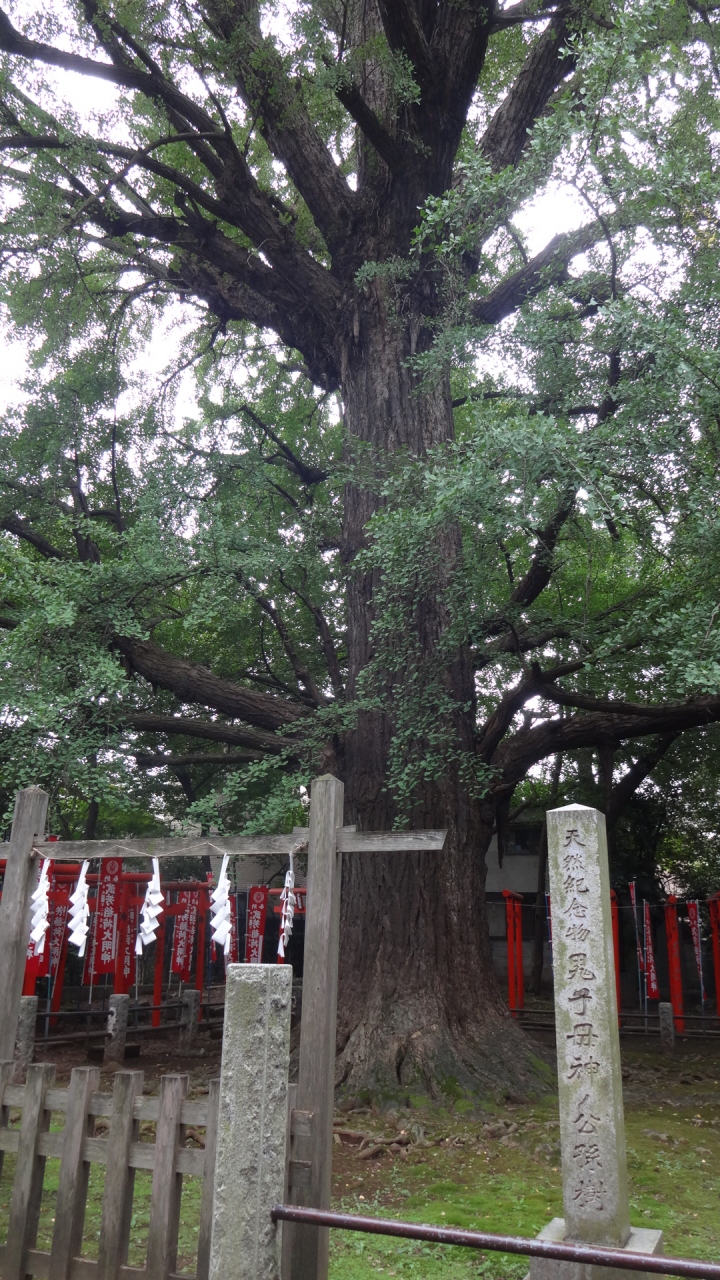 東京メトロ副都心線の「雑司ヶ谷」駅または都電荒川線「鬼子母神前」駅から徒歩約5分ほどのところにある法明寺境内にあります、樹齢600年、高さ33m、幹の周囲8mの巨木です。「子授け銀杏」とか「子育て銀杏」とかいわれています。イチョウ独特の枝から垂れている「気根」が、まるで母親の乳房を連想させるからでしょうか。そういえば、「鬼子母神」は、安産・子育(こやす)の神様といいますよね。都の天然記念物に指定されています。
