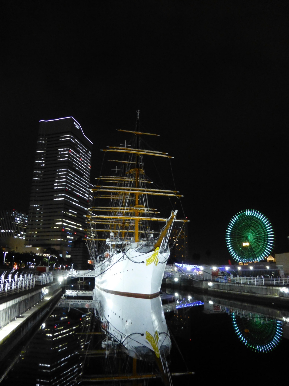 いつも見えてはいたのですが,今回,初めて近くまで行きました.昼間に行くと博物館が開館していたり,レストランがあったり,日時を選べば展帆が見られたりします.夜はライトアップされていますが,博物館のほうは閉館しています.でも,ドック内には水を張った状態で展示しているので,ライトアップされた姿は水面にも映ってとてもきれいでした.