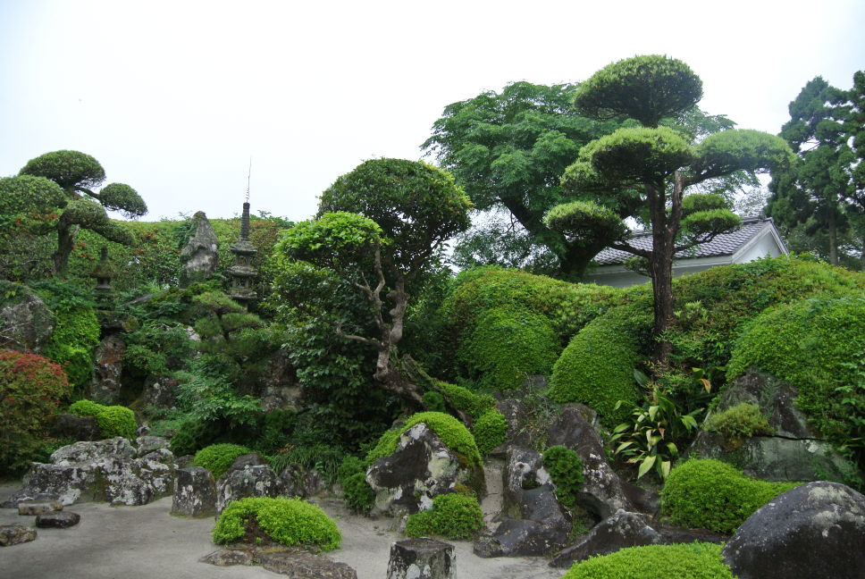 庭園は石を多く使用しており、塔もあって、水墨画のような風景です。植木や生垣もきれいに刈り込んでありますが、なかなか大変だろうなと思います。