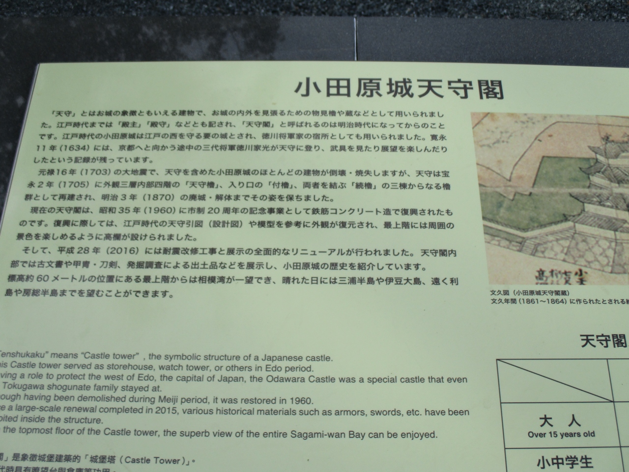小田原城の天守閣は、昭和35年に市制20周年記念事業として、総工費8千万円をかけて復興された小田原市のシンボルです。今年改修工事が完了し、内部は大変きれいになりました。北条氏時代の歴史を伝える様々な展示があり、我々夫婦は見学に2時間以上を要してしまいました。最上階の展望デッキ(廻廊)からは、箱根の山々や伊豆半島、相模湾をよく見渡すことができます。
