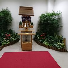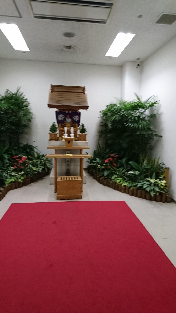 ちょっと奥まったところにあってバックヤード的な雰囲気のするところですが、職員専用というわけだはなく、一般の人もお参りできるようでした。社殿は小さいものですが、一室が神社になっていて、榊も供えられていました。