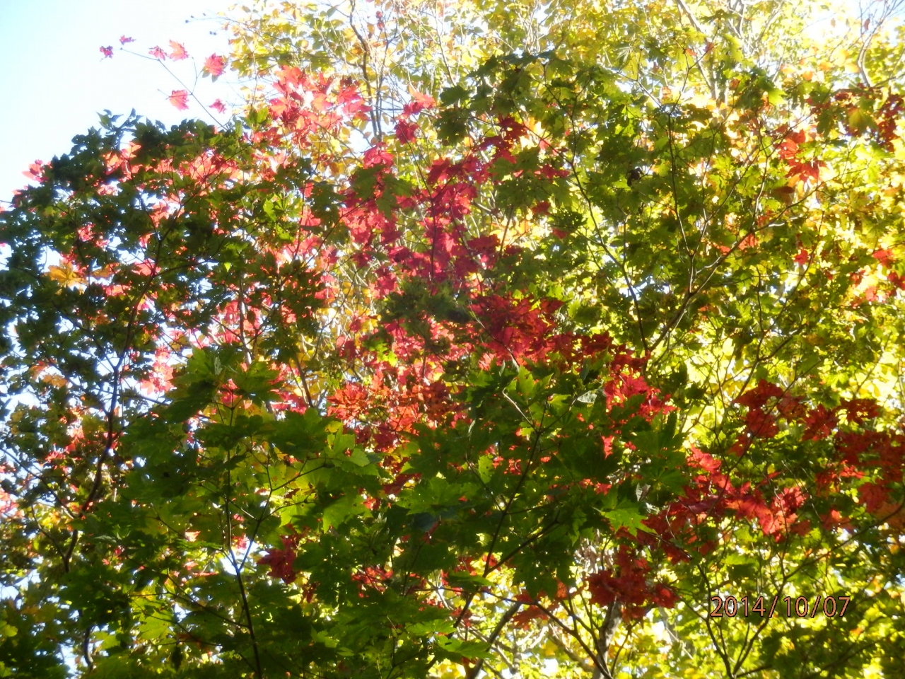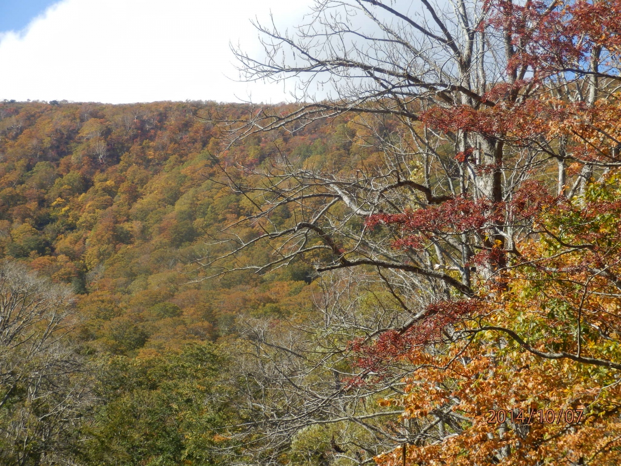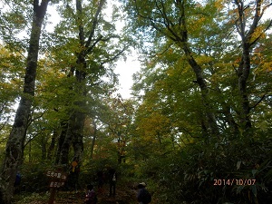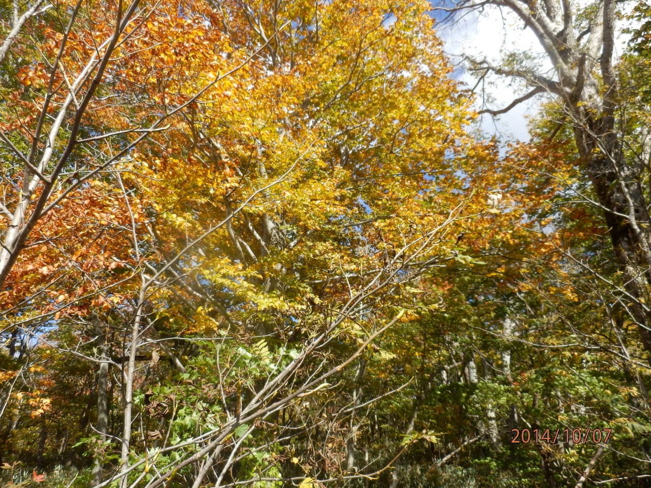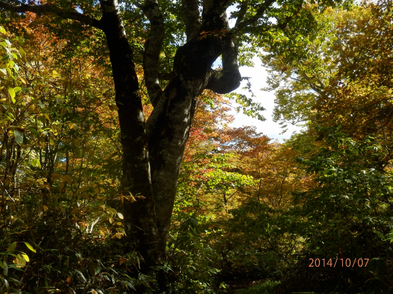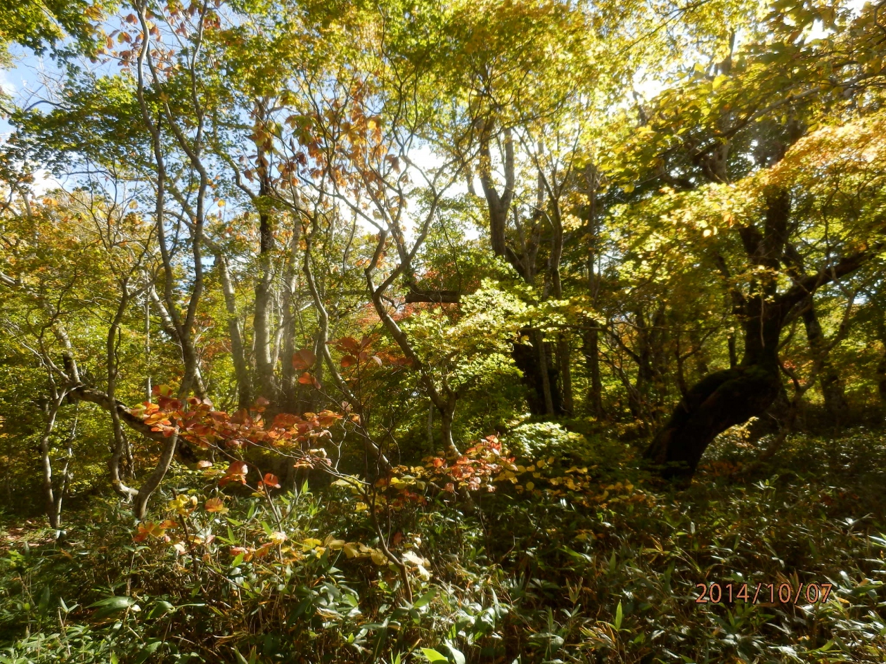 船形山に登る予定でしたが、登山口到着が遅れ帰京時間と登山時間を考慮して登山を断念し、鈴沼散策に変更しました。なだらかな多少小さなアップダウンのある遊歩道を歩きました。いたるところに真っ赤、黄、赤茶色したカエデ、広葉樹等の紅葉が見られました。特にオオバモミジの紅葉は真っ赤で見事でした。またブナ林、遠方の錦秋もすばらしい光景でした。