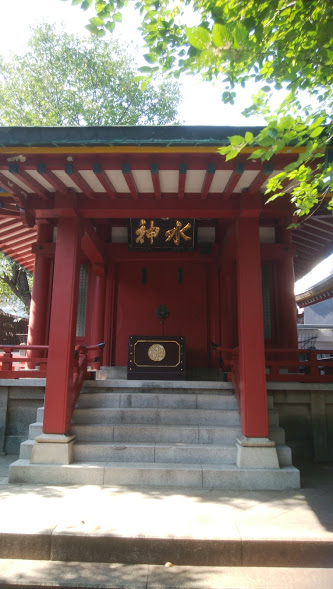 神田明神の境内の本殿の周囲にはたくさんの末社や石碑などが設置されていますが、そのうちの一つがこちらの魚河岸水神社です。鳳凰殿の真裏あたりにあります。朱色に塗られた柱、梁があって、正面入り口の上部には社名を記した額が掲げられています。特にその額の文字は金文字でかなり太い筆跡で「水神」と記されており、力強さを感じる印象深い額です。この社自体は徳川家の武運長久と併せて大漁安全を祈願するために、魚河岸関係者によって、かつての神田神社と同じ場所に鎮座された。