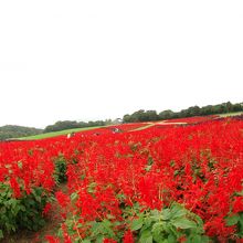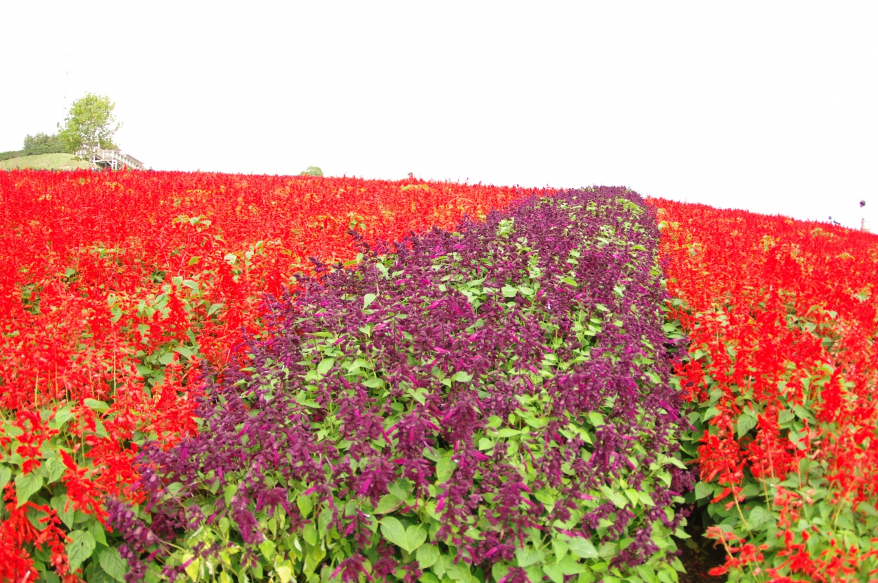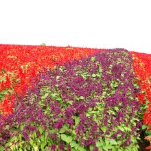 広い山の斜面に赤白紫のサルビアがきれいに並んでいました。