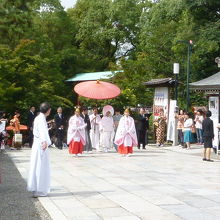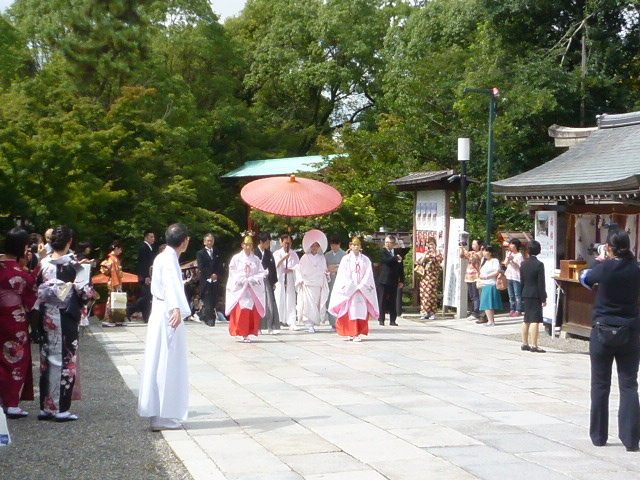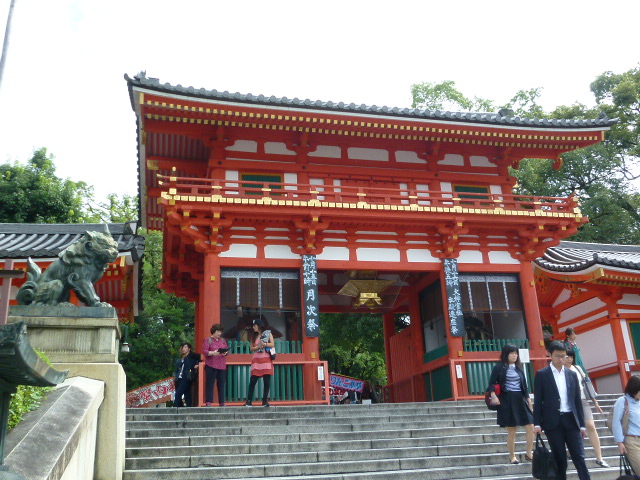 今日は京都・八坂神社に来ています。四条通りの東の突き当りに「八坂神社」はあります。道路は一直線になっていますので四条大橋からも見えますね。通称祇園さんとも呼ばれ明治維新までは祇園社とも呼ばれていました。ここ八坂神社はたくさんの年間行事がありますが、中でも元旦に行われる、病気や災難を取除き幸福を祈る、白朮(をけら)祭や祇園祭の後祭の7月24日に実施される花傘巡行は見ものです。事前に予定表を調べて訪問くださいね。今日は結婚式が執り行われてました。