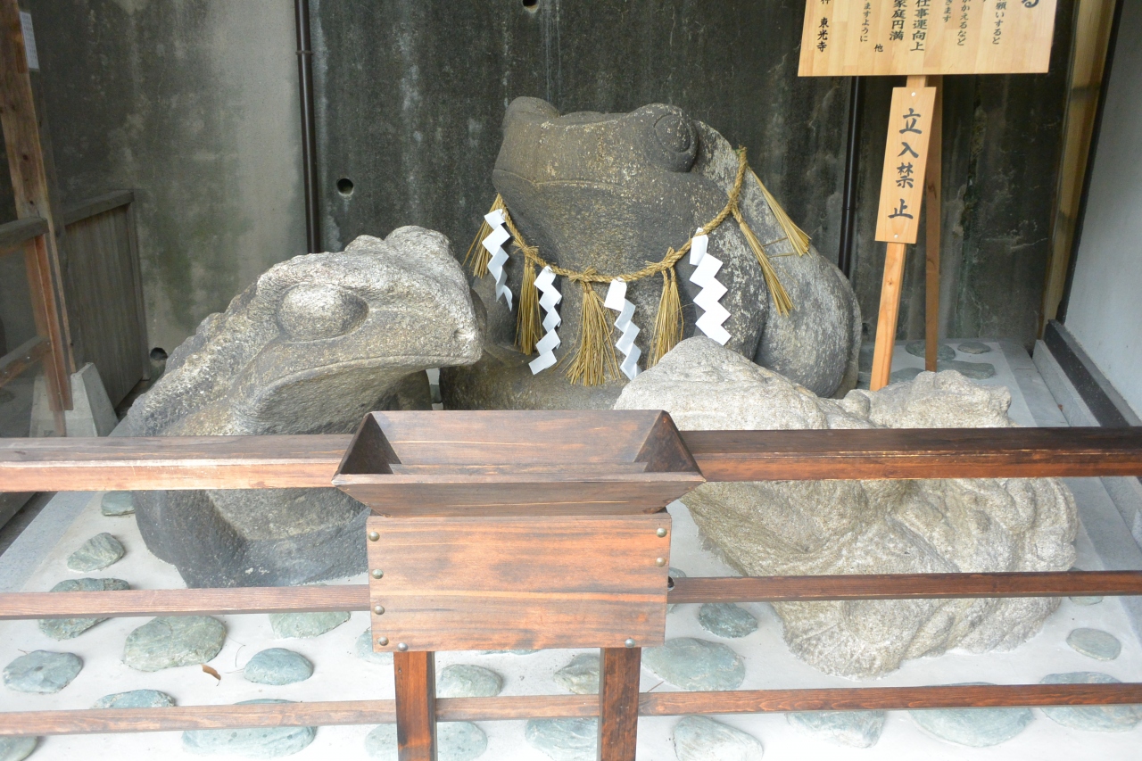 場所は延命魂や宝輪杉と同じ並びにあるので、すぐわかると思います。そこそこ大きなかえるの石像が三匹鎮座しています。蛙は田んぼで虫を食べてくれ、「よみがえる」や「生まれかわる」などの語呂から、いいイメージの生き物で、このお寺でも願いを叶えてくれる信仰の対象です。