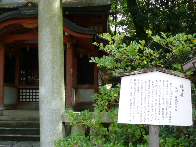 今日は京都・八坂神社に来ています。四条通りの東の突き当りにある西楼門から入ってぐるーとまわります。西楼門を通って目の前にあるのが「疫神社」です。蘇民将来を祀る、祇園祭厄除けちまきの起源とされる神社です。しかし観光客の目は直ぐ右の露店方向へ向いています。もっとゆっくり見学してくださいね。日本三大祭の祇園祭の締めとなる夏越祭(なごしさい)は、ここ疫神社ですよ。その日は、鳥居に取り付けられた大きい茅の輪をくぐり厄除けをします。八坂神社はさまざまが行事がありますので、日程に合わせて楽しまれてはいかがでしょうか。