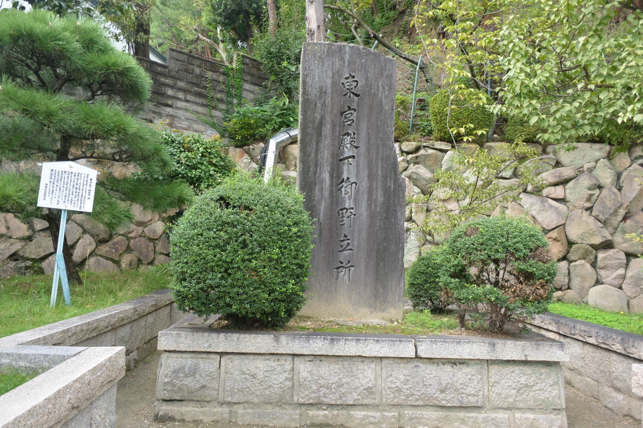 門戸厄神の参道を上がりきった門の横にあります。(この門は出口になります)東宮つまり皇太子(のちの大正天皇)が陸軍の演習をこの地でご覧になった記念に建てられた石碑です。当地に来られたことが、とても名誉だったのですね。門戸厄神さんの参拝の時には必ず目にすることと思います。