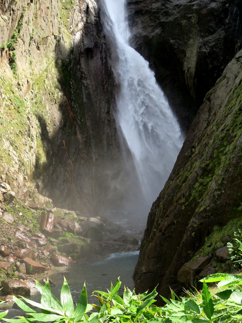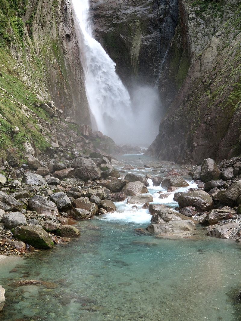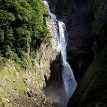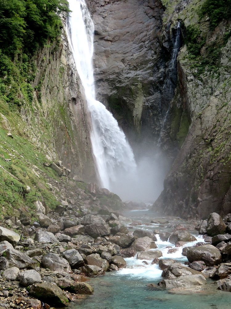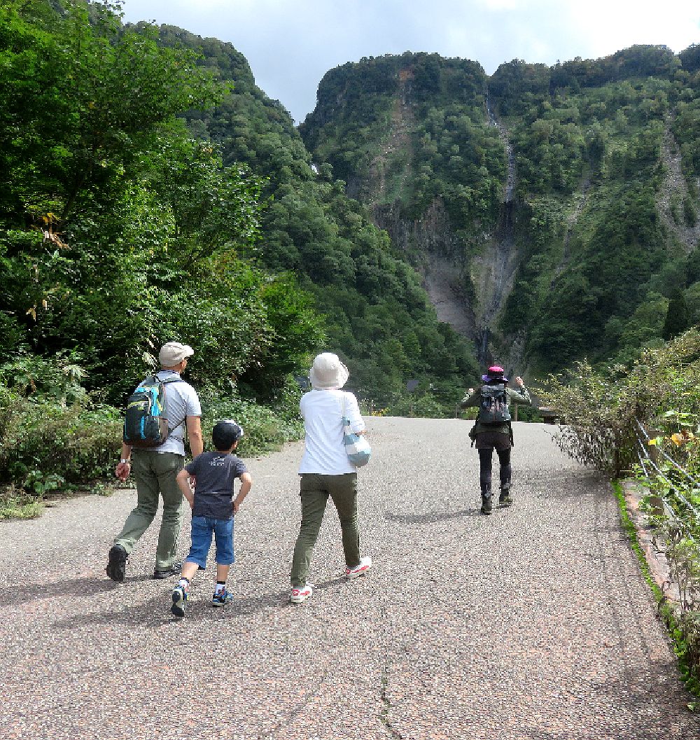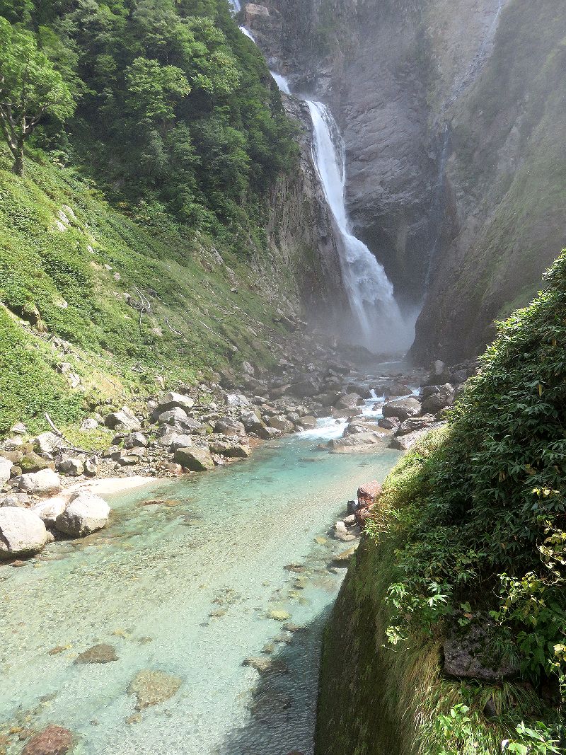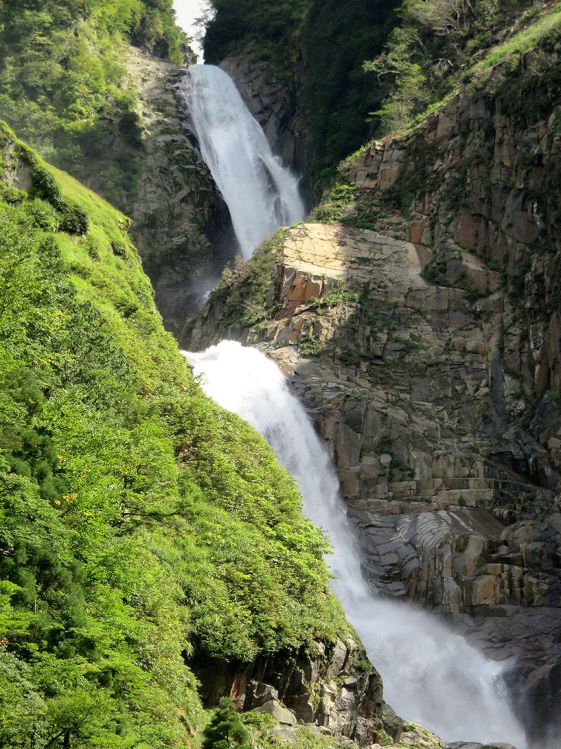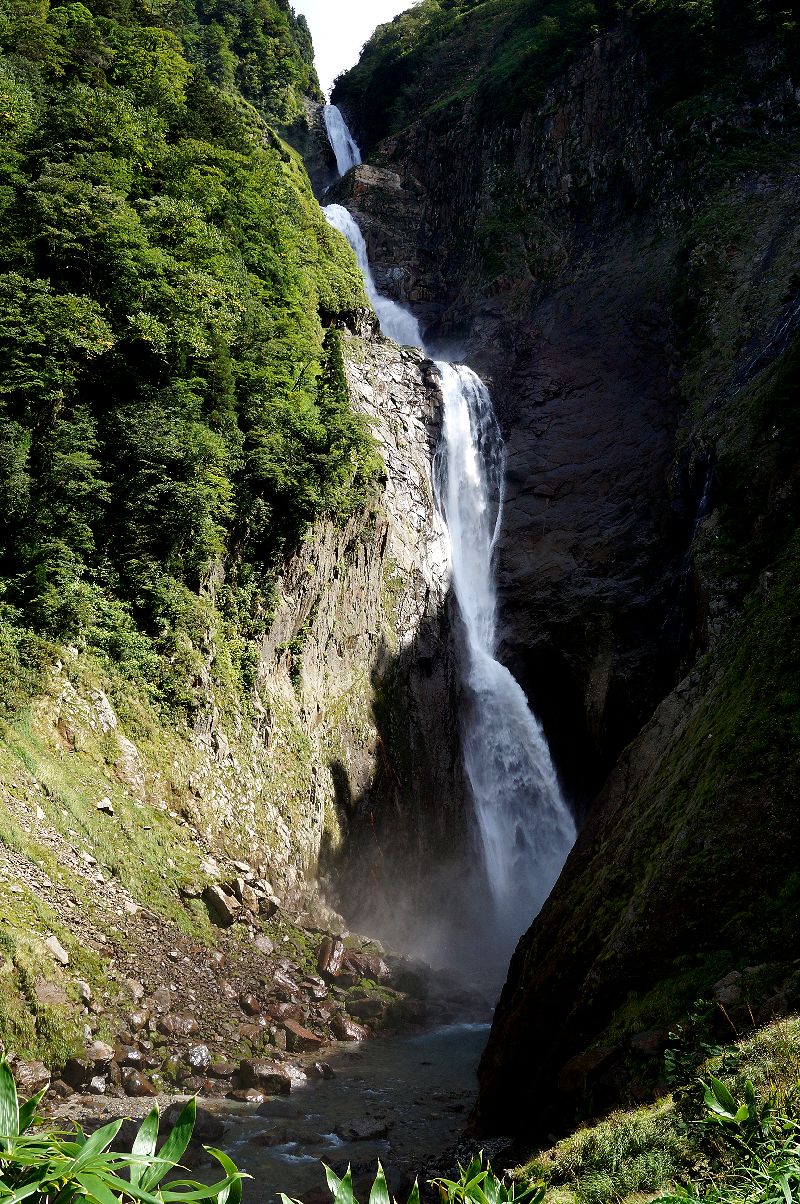 富山県立山町にある日本一落差のある(350m)滝として知られている。私達は大昔夏に訪れており、2度目の訪問。立山駅から車で十数分のところに駐車場があるが、11時ごろということであいにく満車。仕方ないので、帰りに立ち寄るつもりで駐車場の先のレストランに駐車せざるを得なかった。紅葉のピーク時は駐車が大変そうだ。そこから滝の上の方が少し見えるが、滝までは1.3キロの登り坂を暑い中歩かなければならない。その時ばかりは太陽が恨めしかった。20分から30分歩いて、ようやく橋のたもとに到着。水しぶきで暑さも和らいで、気持ちよかった。橋の上での撮影はカメラにはよくないので、橋を渡った先に急な階段があり、上の展望台で水しぶきを浴びずにゆっくり撮影することができた。ちなみに、立山黒部アルペンルートを美女平から室堂に上る途中、バスの中からも遠くにこの滝を見ることができる。