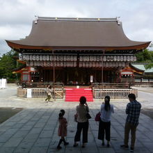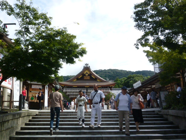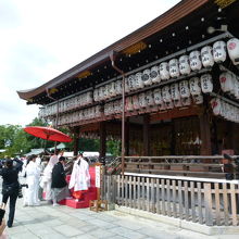 今日は京都・八坂神社を散策しています。西楼門から入って右へぐるーと回って行くと正面に「舞殿」に到着します。また南楼門からは門を通ると目の前にあるのが「舞殿」です。舞殿は歌舞伎などの奉納行事が良く行われていますが、結婚式も行われています。ちょうどその時に出会いました。観光客も写真撮りに夢中です。特に海外からのお客さんにとってはラッキーだったに違いありませんね。ちなみに沢山の提灯が吊ってありますが、省エネのLEDを使用しているとのことです。古きを守り新しいものを取り入れていますね。少々時間がありますので結婚式を拝見します。