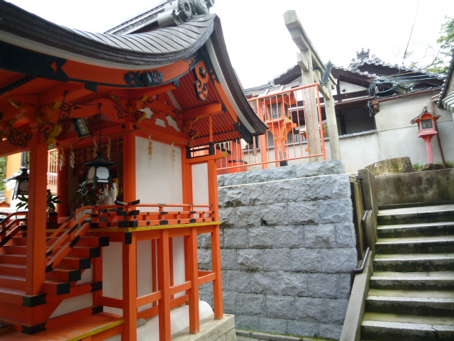 今日は京都・八坂神社を散策しています。そして西楼門から入って舞殿で結婚式を見て、まっすぐ行くと円山公園へとつながる出口がありますがその手前右手に「玉光稲荷社」はあります。ここは八坂神社の末社で五穀豊穣や商売繁盛ご利益があり、3月と11月に春季祭と秋季祭が盛大に行われます。また奥の階段を上がって行くと奥宮の命婦稲荷社があります。いずれも稲荷社で狐が幸せを運んできます、是非参拝してくださいね。奥宮までは数段の階段です、合わせてどうぞ。