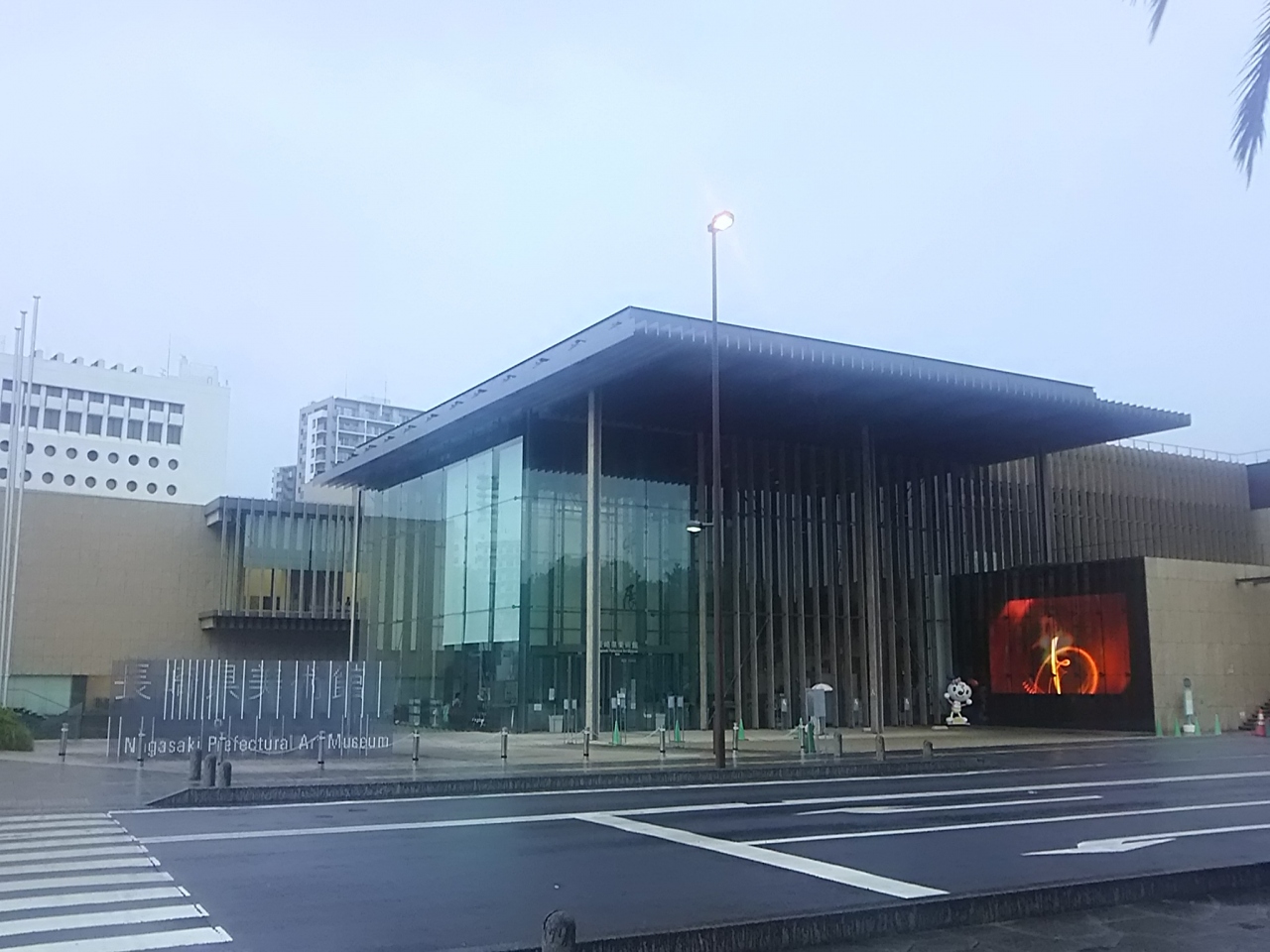 「長崎水辺の森公園」に隣接する自然との調和をめざして建てられた美術館です。展示室以外は無料スペースで、ガラス張りの光に満ちあふれた広々としたエントランスホールを、”長崎をさるく(歩いて廻る)”して、疲れた心身をリラックスできるスペースとして利用させてもらいました。