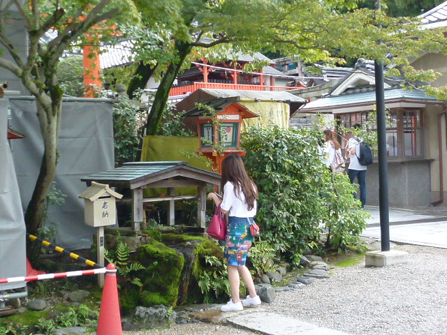 今日は京都・八坂神社を散策しています。そして本殿の東側来ていますが見どころが数ヶ所あります。その一番右には「祇園神水」がありますが、ここは祇園の涌き水で力水とも呼ばれ、水を飲んだ後、数m左にある美御神社にお参りすると美人になると言われているようです。私は要らないのですが女性の方が飲んでいました。じーと見ているとこの事を知っているのでしょうか、美御神社の方へ行っていました。「譲り合ってご利用下さい」との表示もあり、女性に人気があるのでしょうね。全国の女性のみなさん是非トライしてください。そしてその成果を口コミに書いてくださいね。