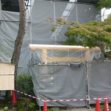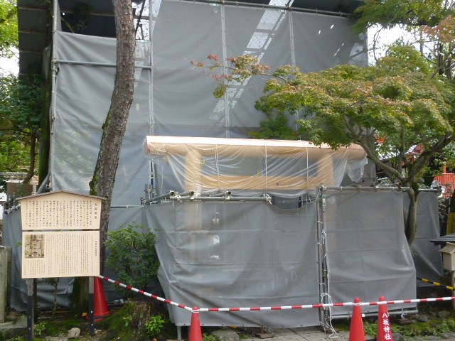 今日は京都・八坂神社を散策しています。そして本殿の東側来ていますが見どころが数ヶ所あります。その一番右には祇園神水がありますが、その左に「大神宮社」があります。大神宮社は、八坂神社の末社で祭神は天照大神と豊受大神です。4月17日に春季祭、10月17日に秋季祭が行われているとのことですが現在工事中でした。今月17日の秋季祭に間に合うのでしょうか。参拝することができませんでしたので次回は参拝したいと思います。